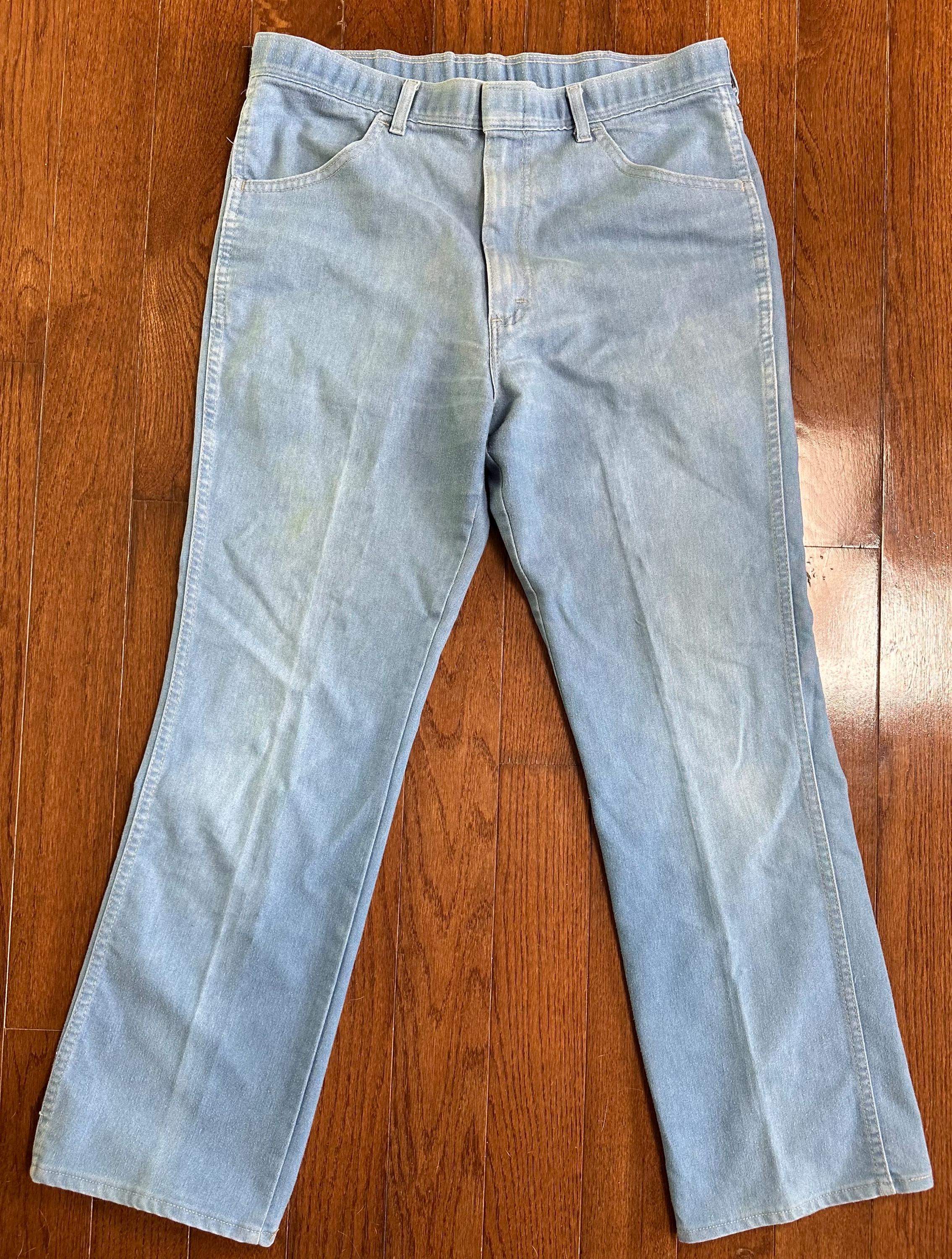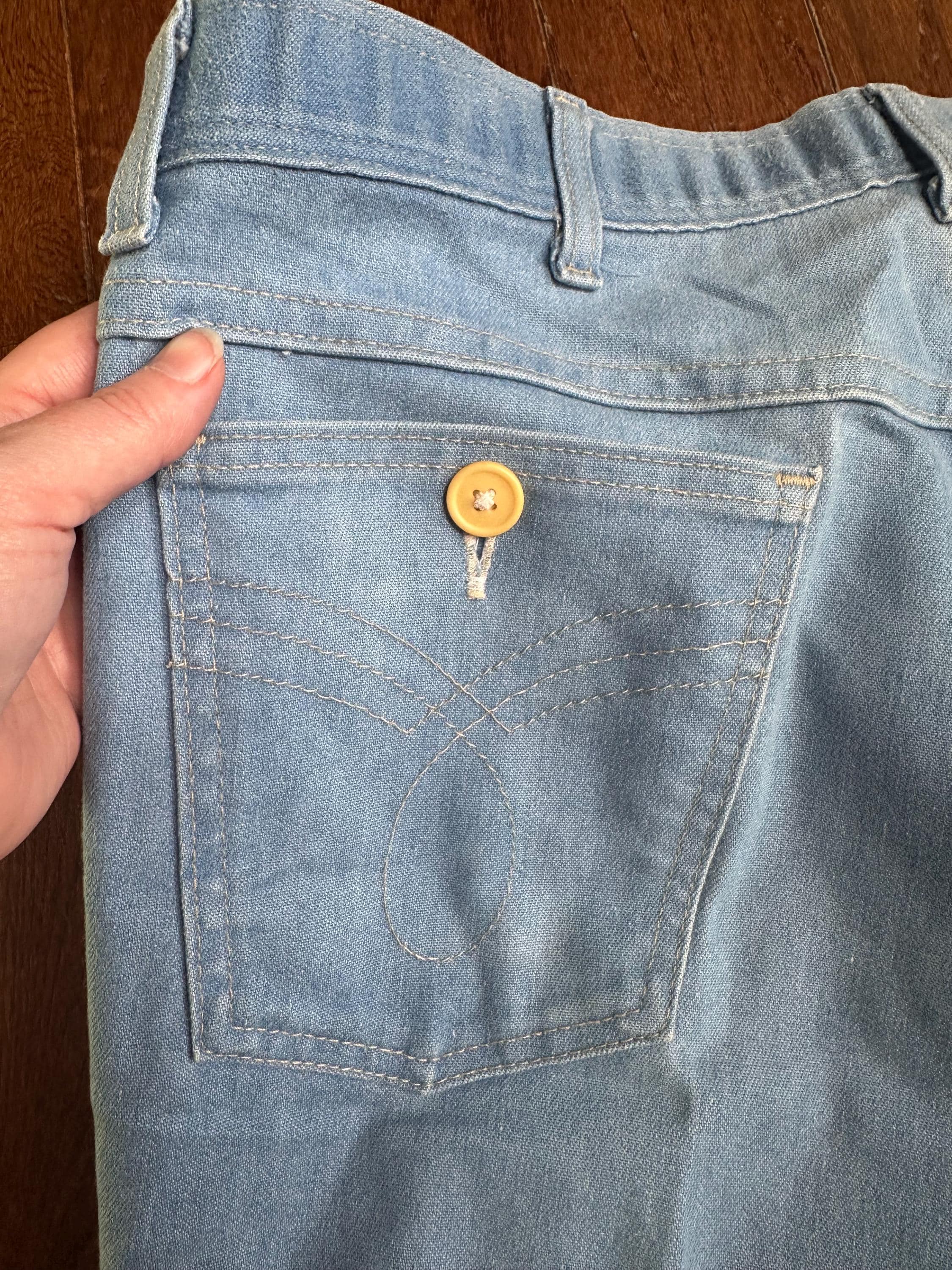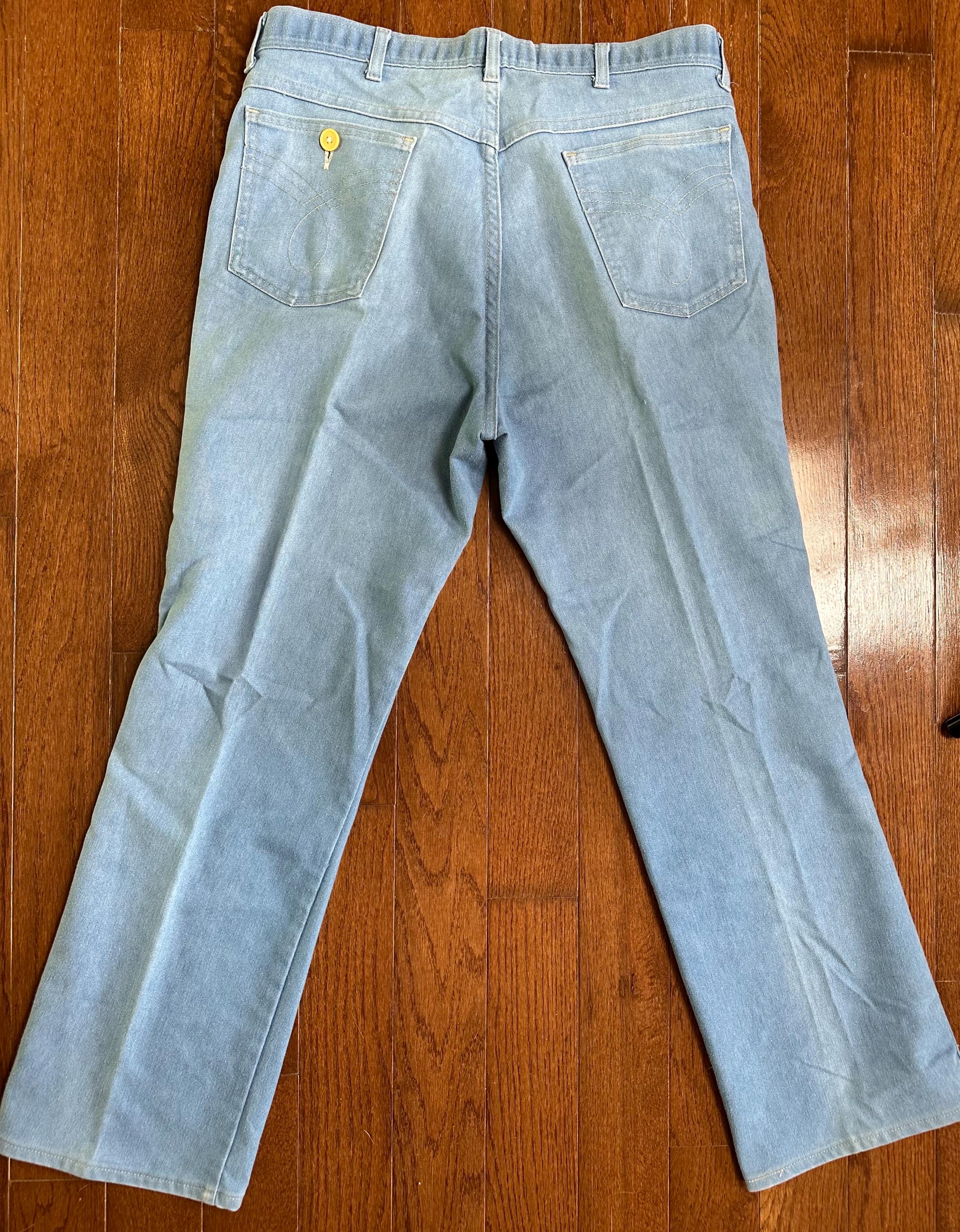 These vintage 1970s lightweight denim pants feature a soft, perfectly faded blue wash with a clean, straight leg silhouette and high-waisted fit. The fabric is lighter than traditional denim, giving it an easy, broken-in feel that wears effortlessly.