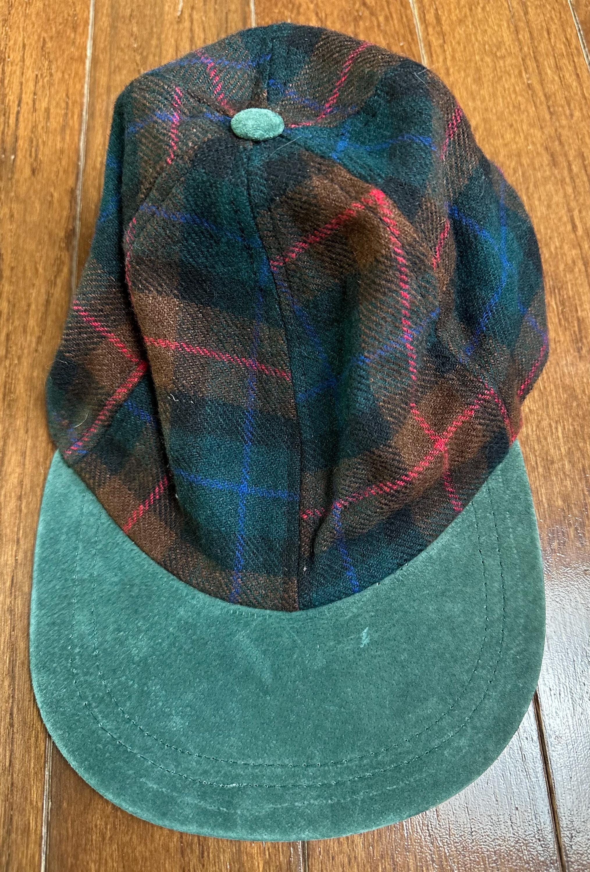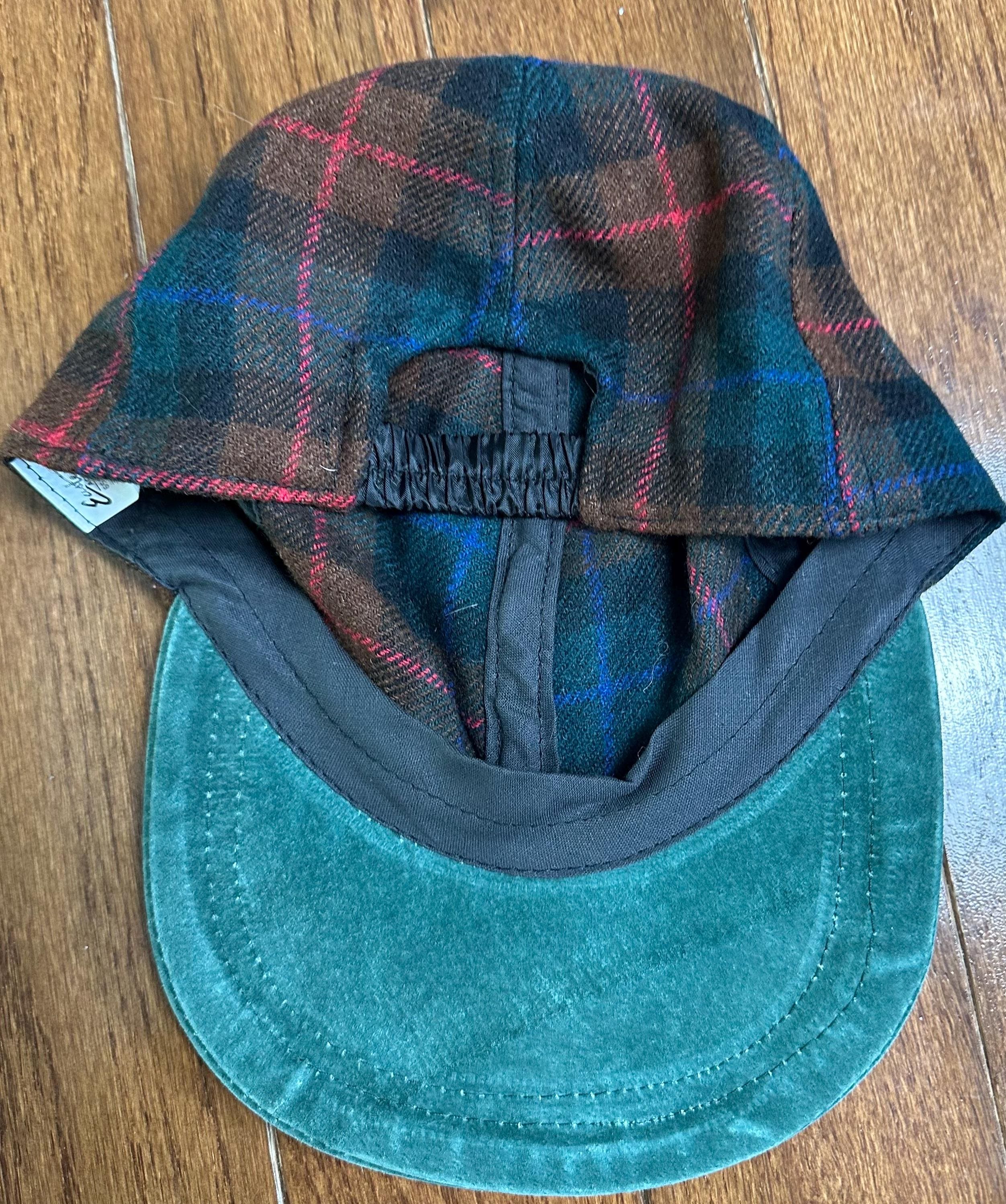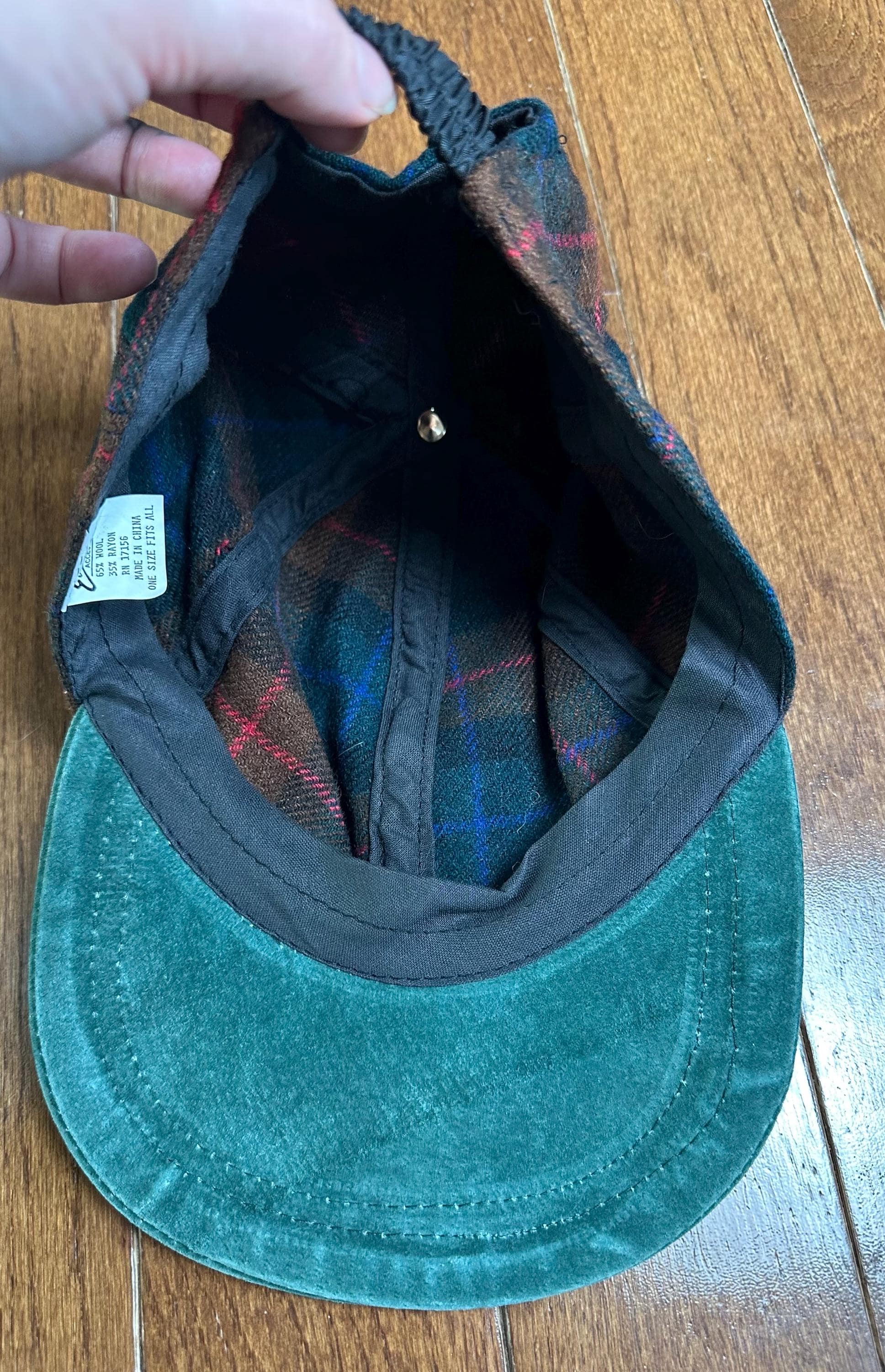 This vintage wool cap features a rich plaid pattern in deep greens, browns, and subtle red and blue lines, finished with a soft green suede brim that gives it a really elevated, textured look.