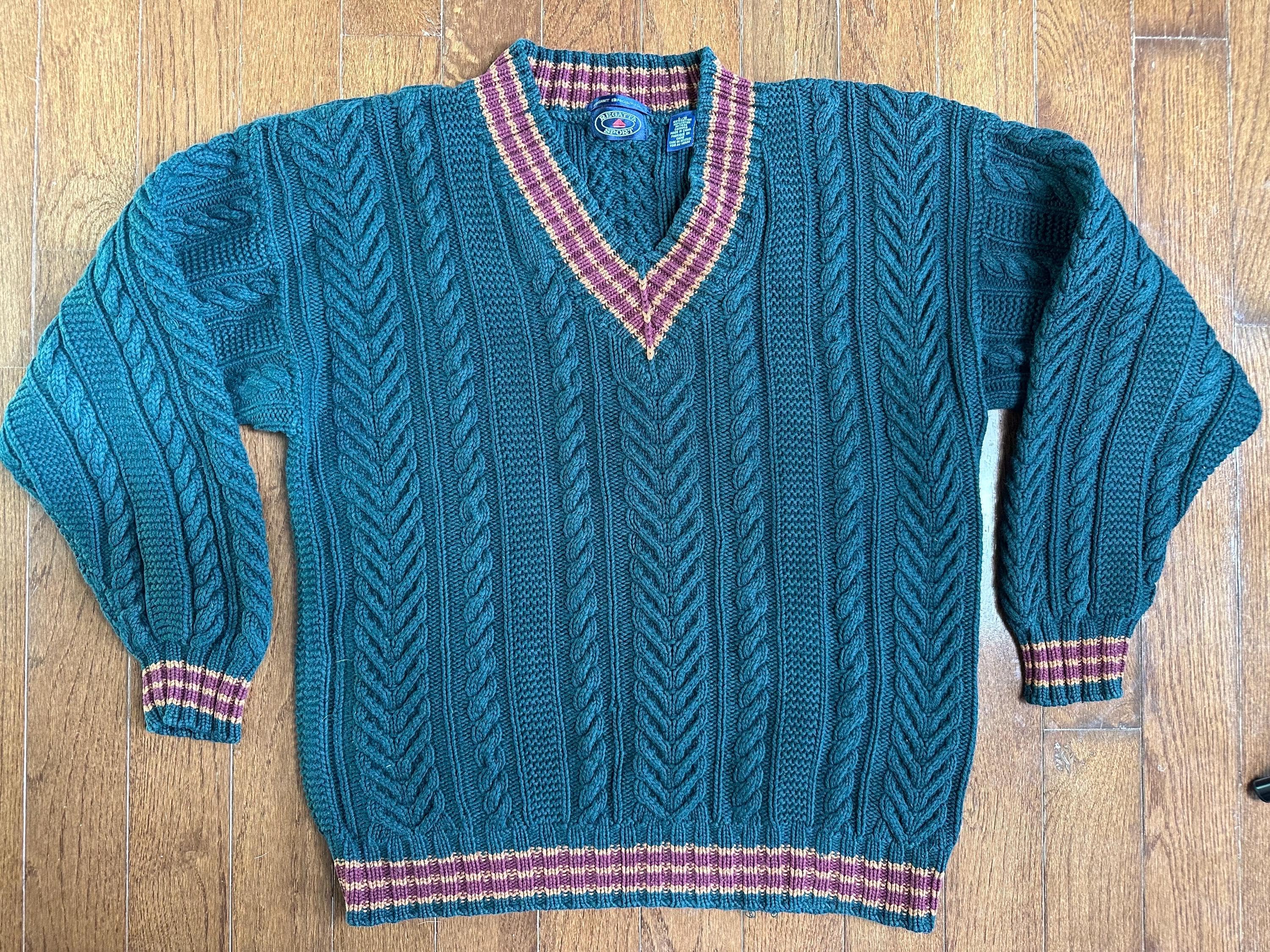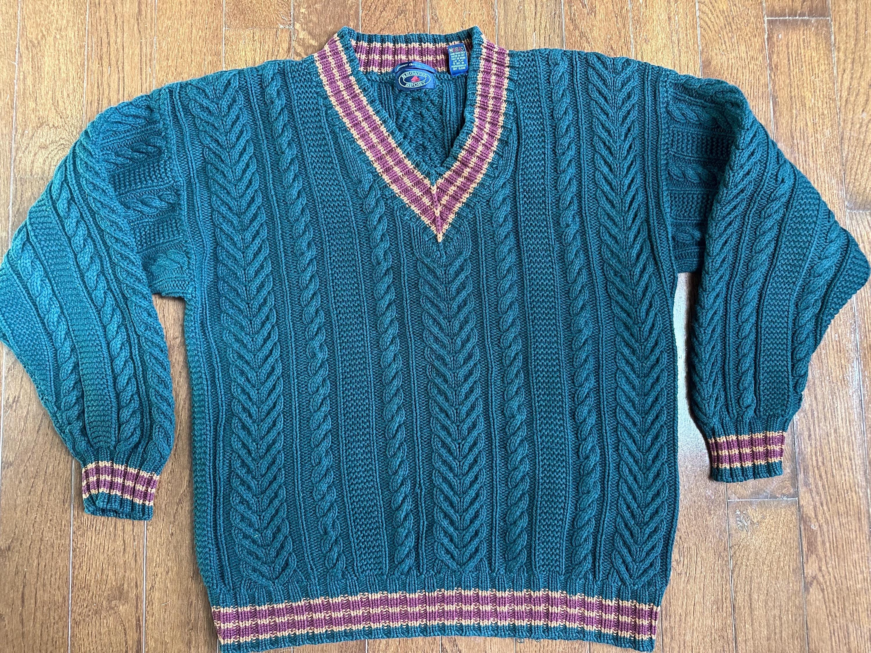 Vintage Cable Knit Sweater Green Cotton Chunky Fisherman Knit V Neck Preppy