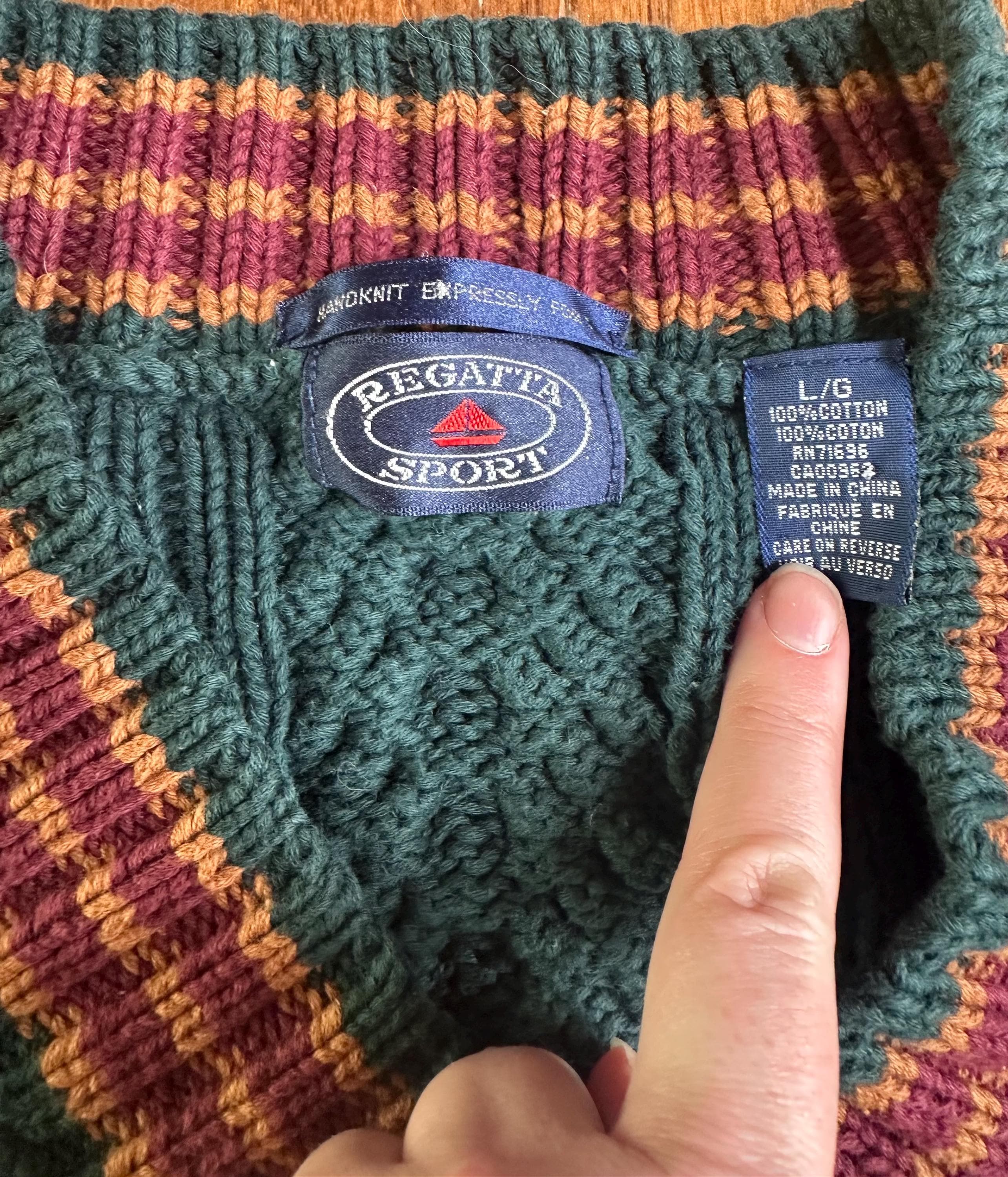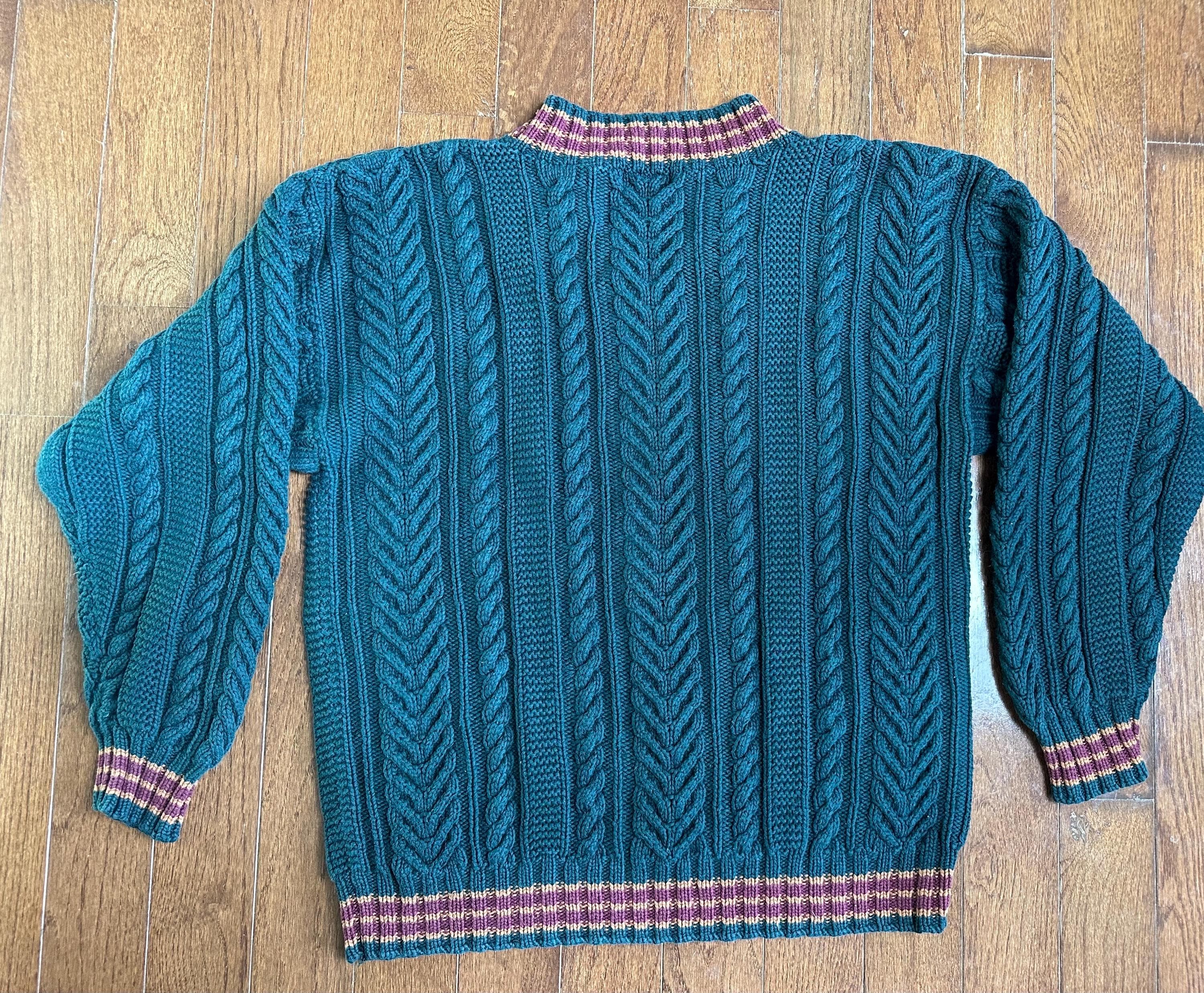 A substantial vintage cable knit sweater in a rich deep green, finished with contrast trim at the collar, cuffs, and hem.
