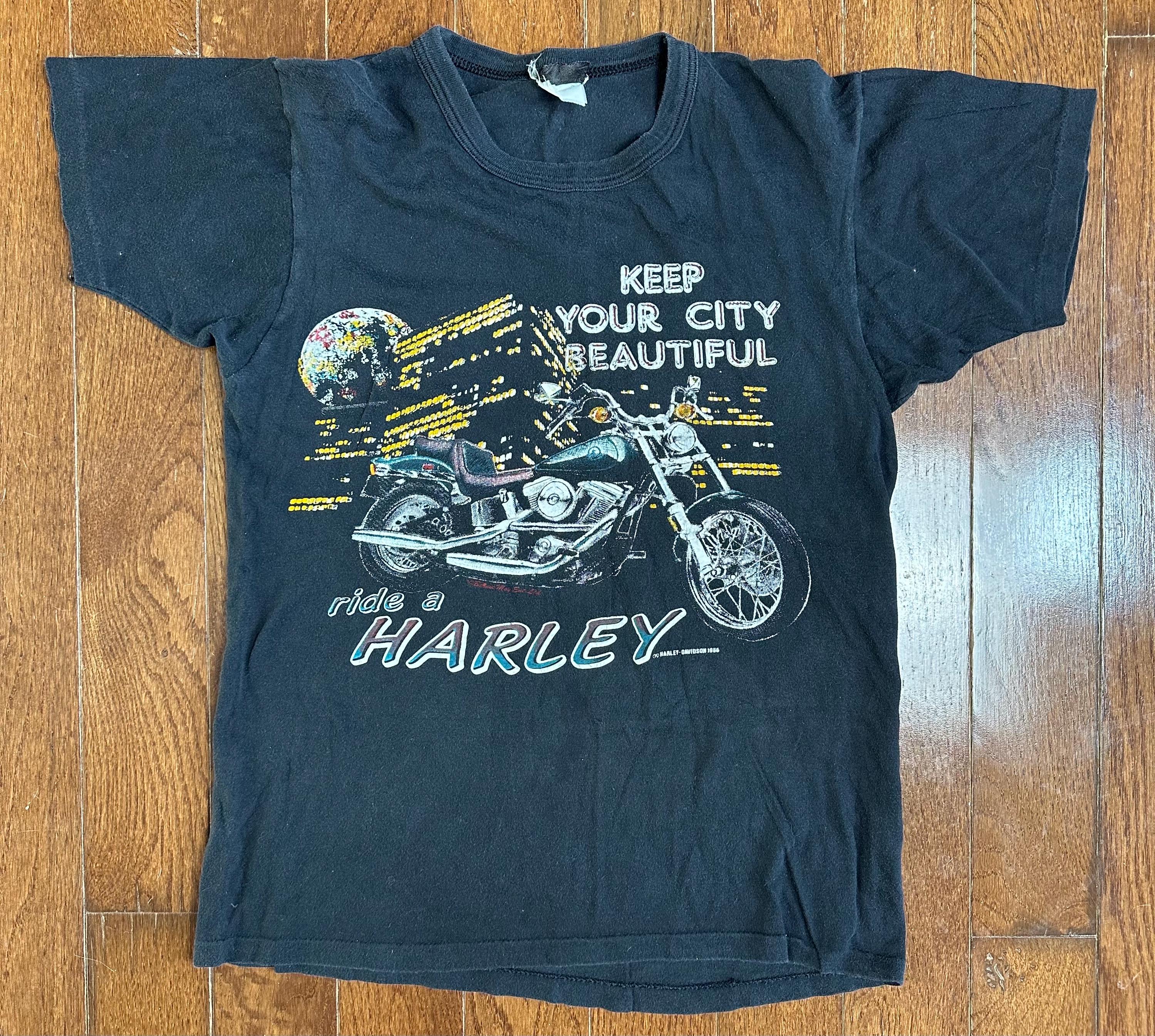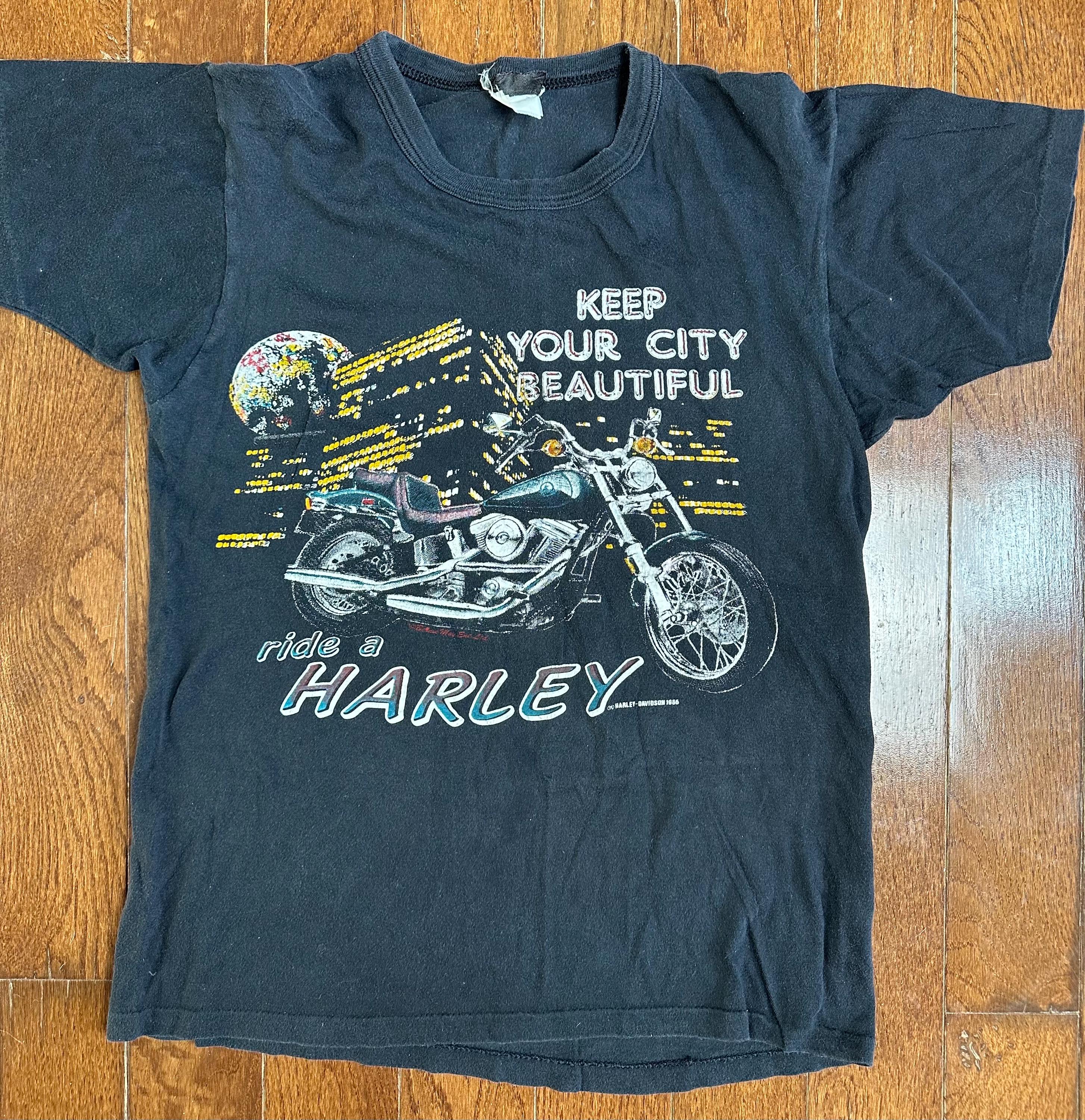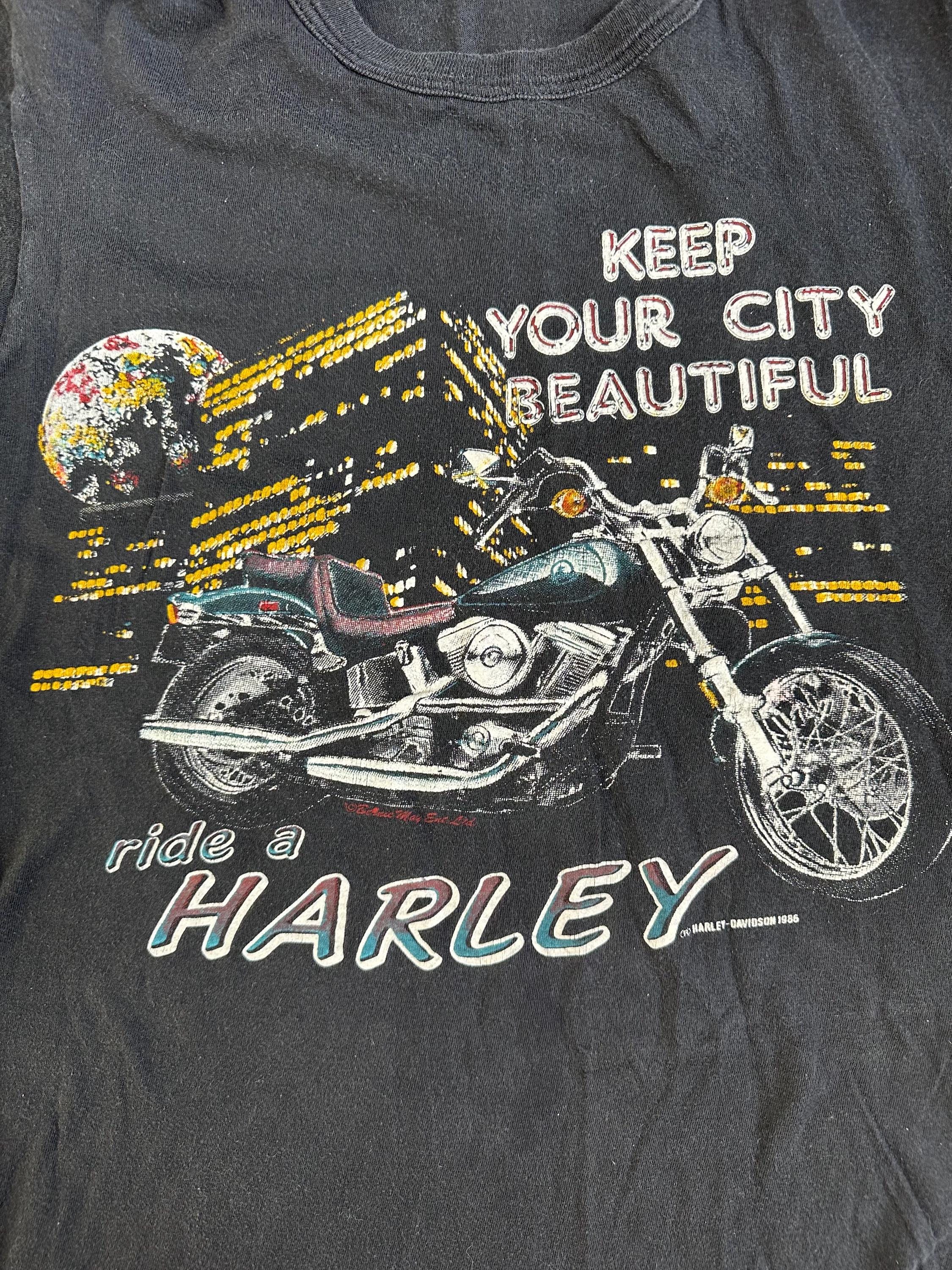 The front features a classic 1986 Harley graphic with “Keep Your City Beautiful, ride a Harley” set against a nighttime city backdrop. It’s bold but still wearable, with that perfectly faded ink that only comes from time.