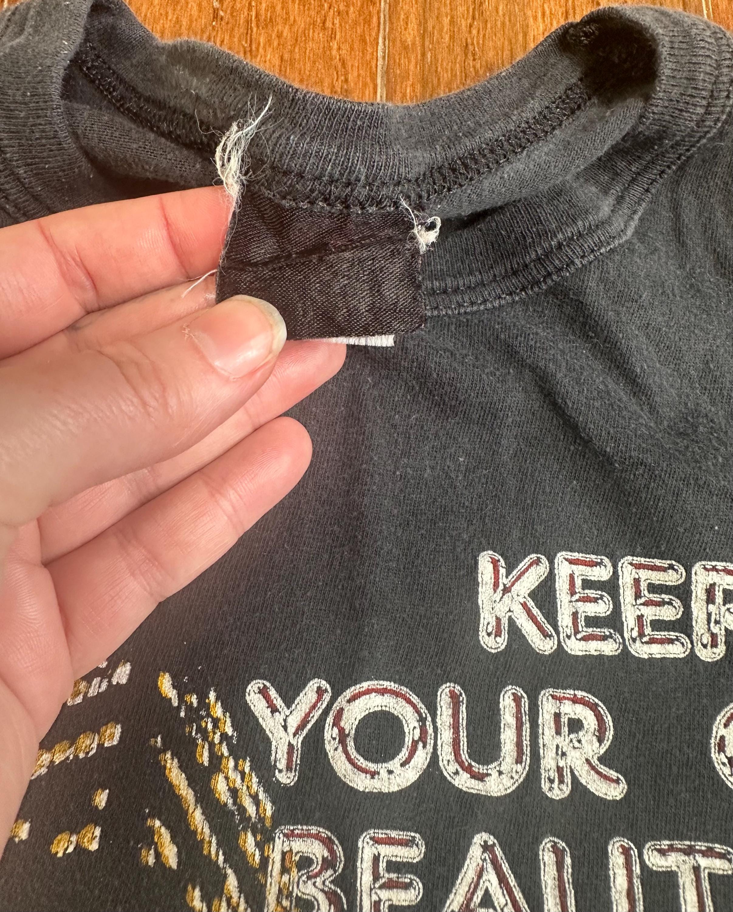 The shirt itself has that soft, broken-in feel with visible wear, fading, and a perfectly aged black that leans charcoal in the light. Tag is worn, but everything about it reads true vintage.