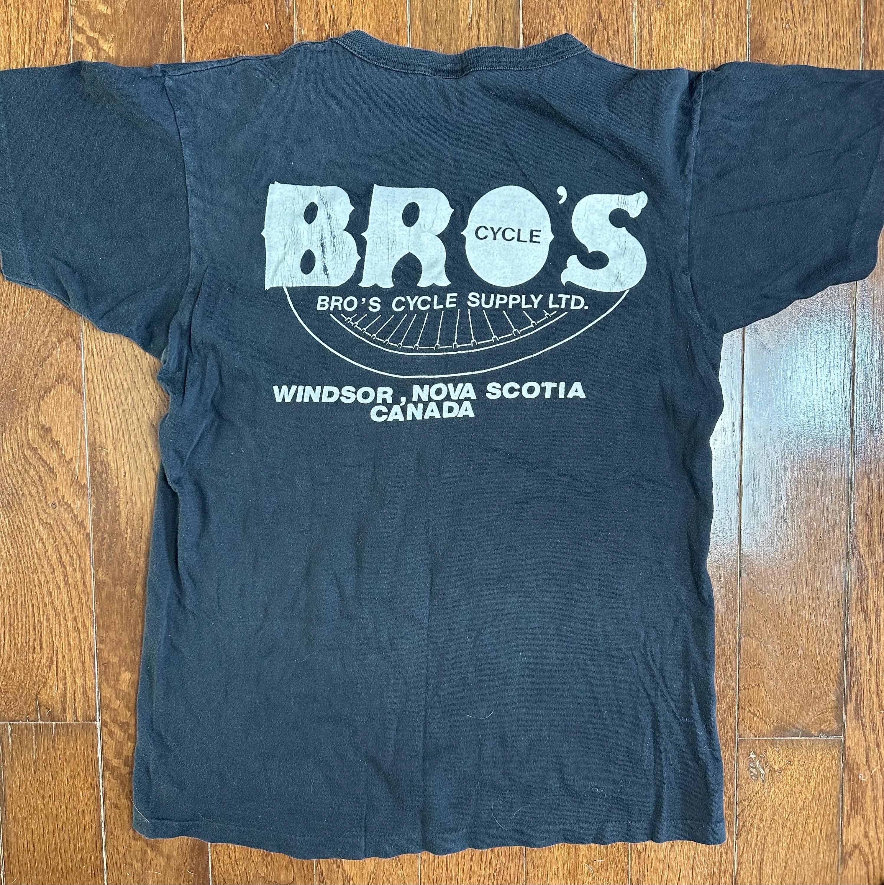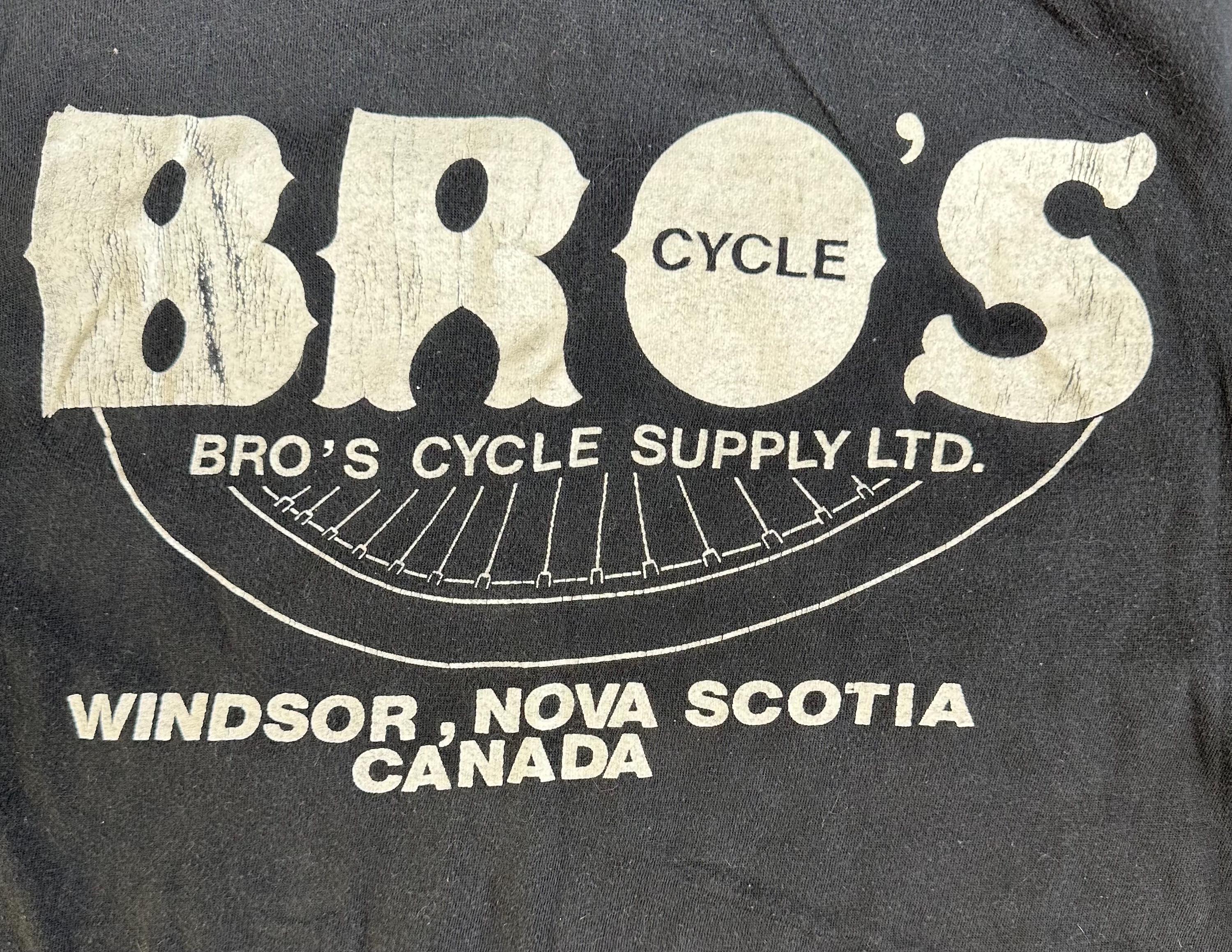The back is what really sets it apart, a Bro’s Cycle Supply shop graphic out of Windsor, Nova Scotia, Canada. Those regional Harley shop tees are getting harder to find, especially from the 80s, and they carry that real road-worn history.
