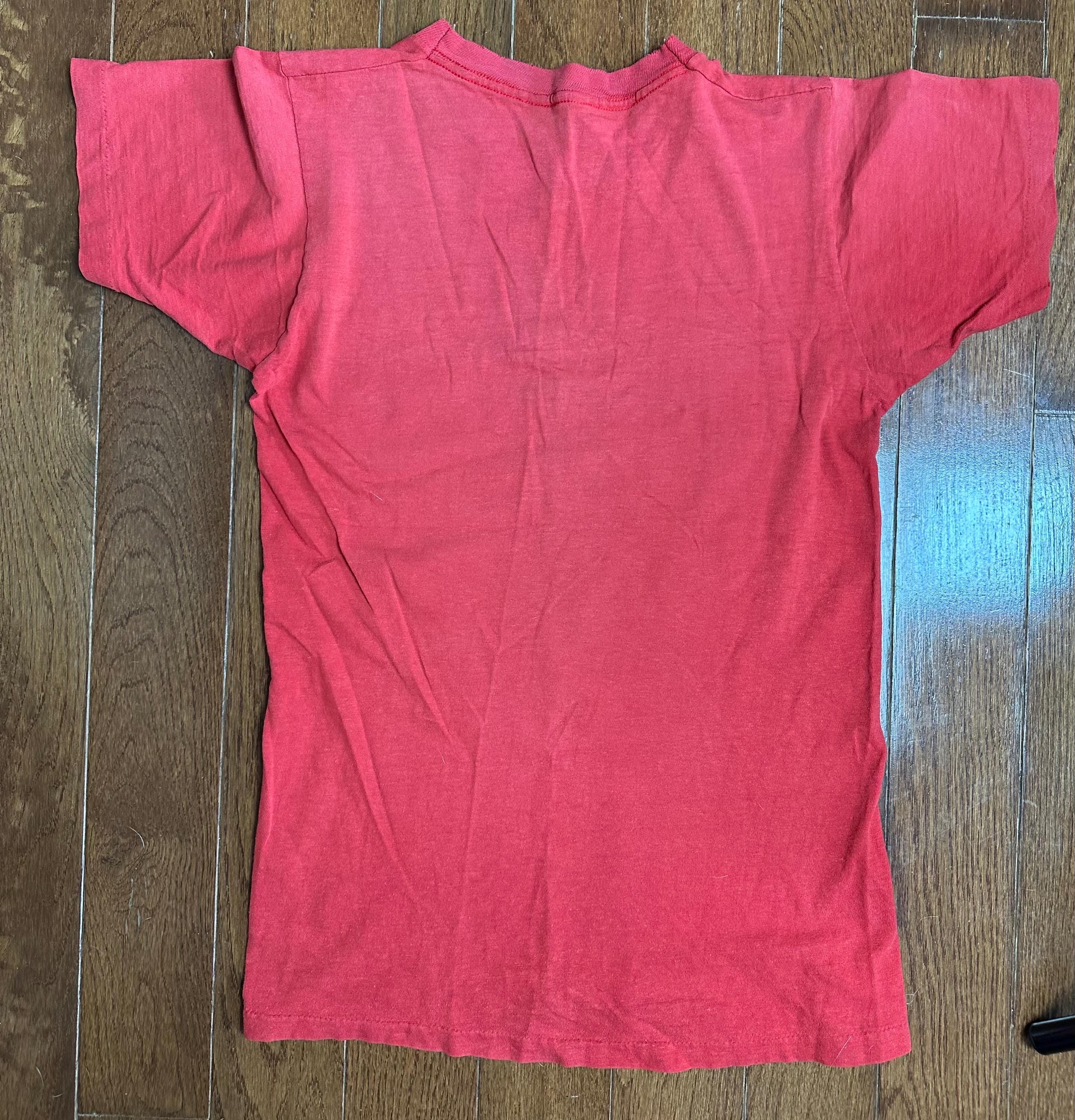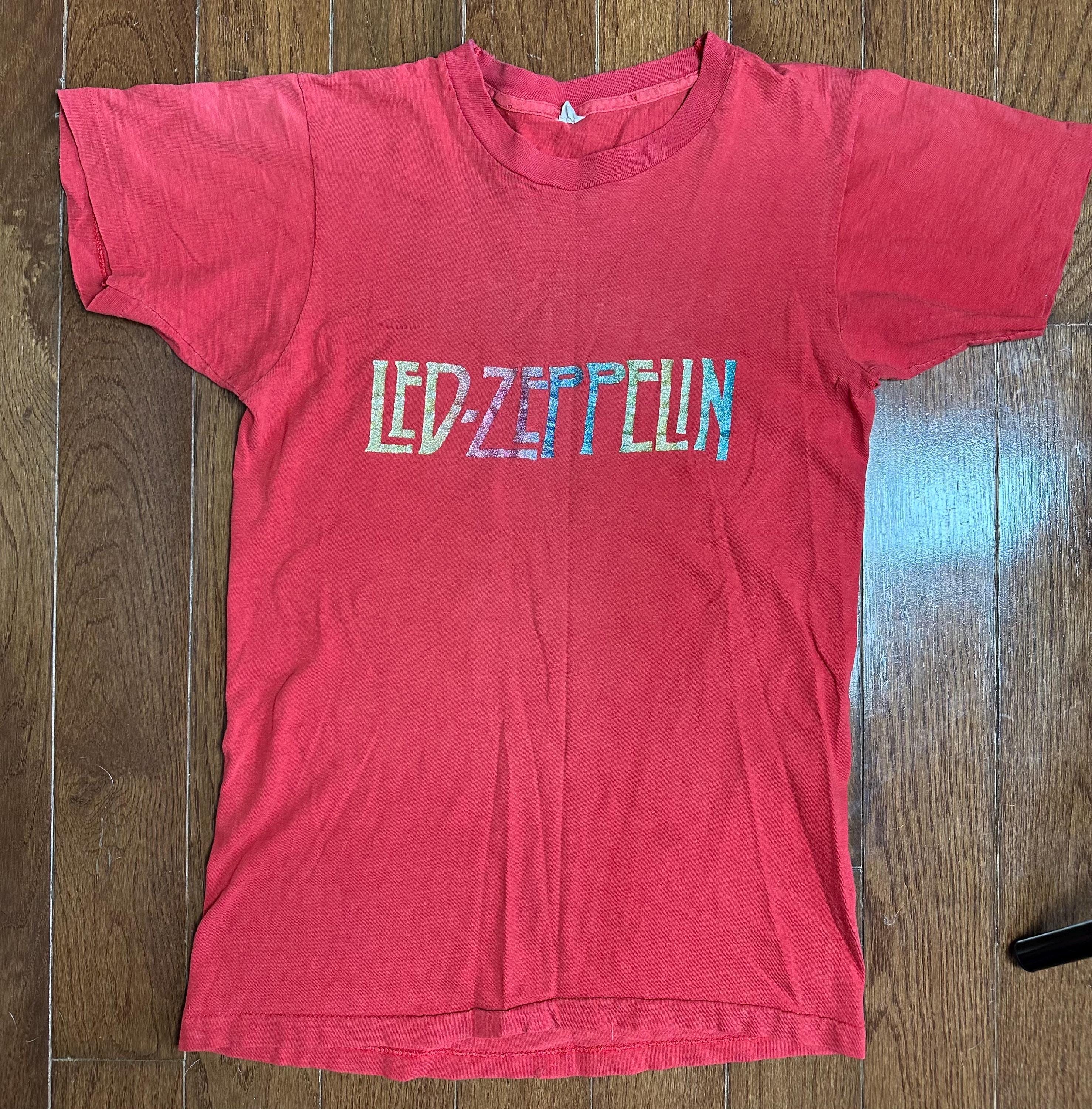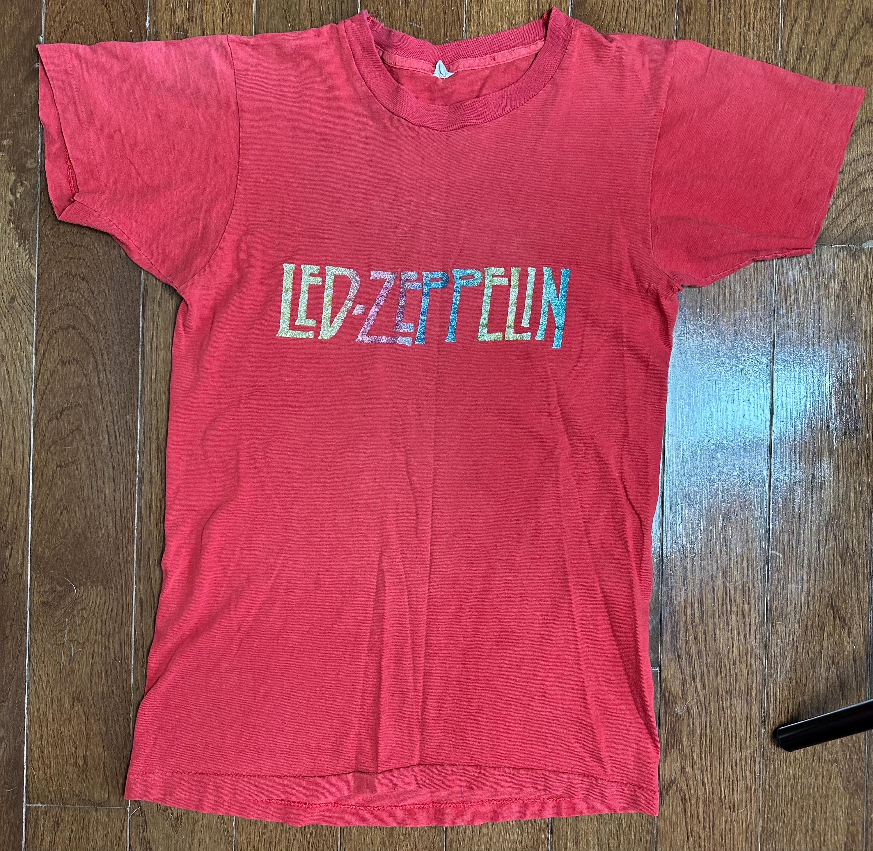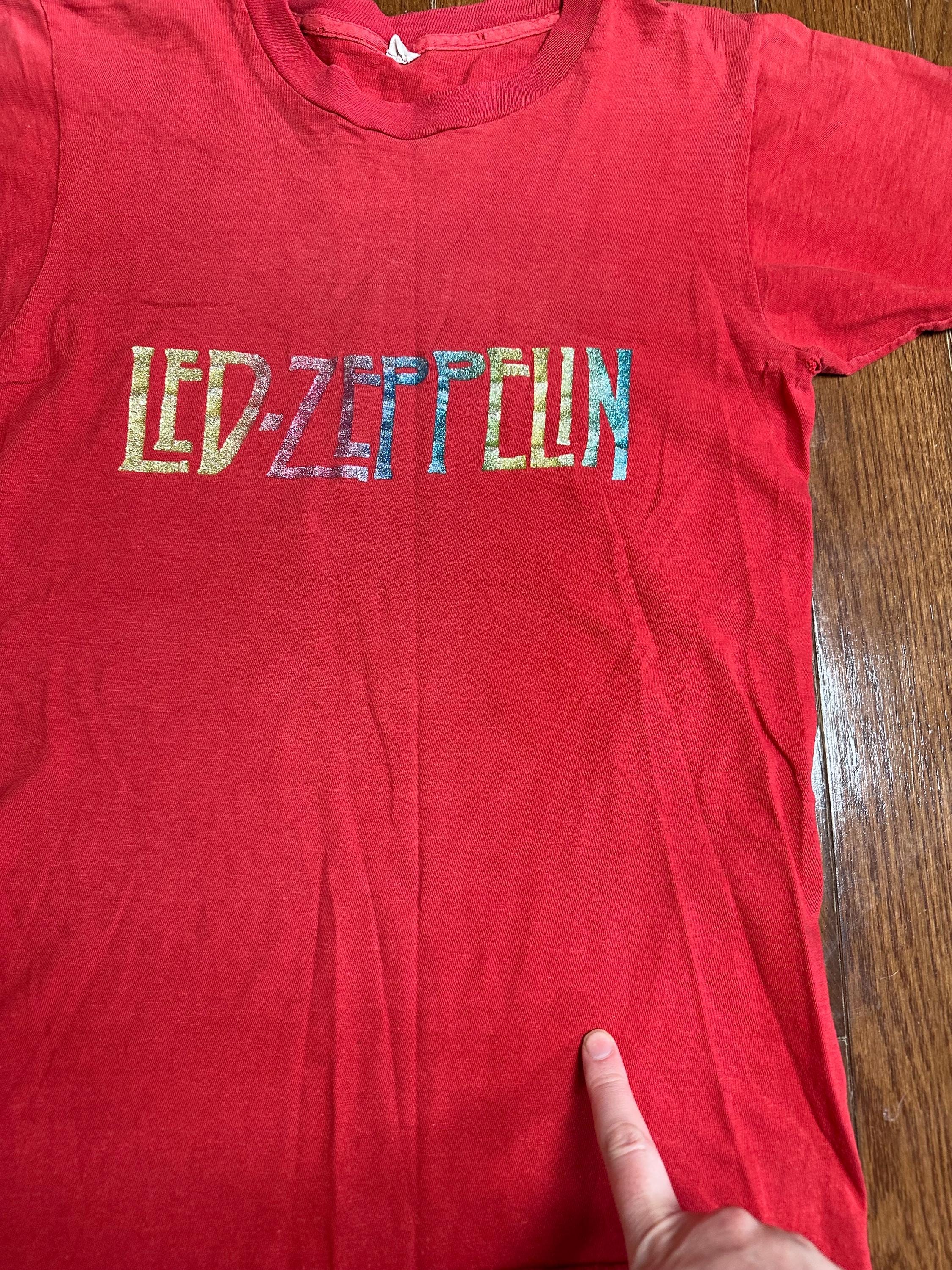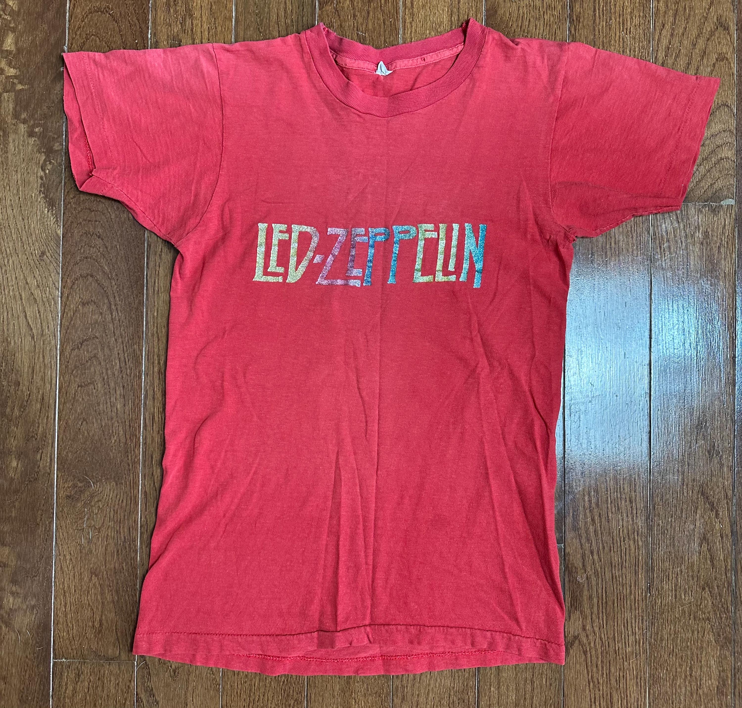 This is an original 1980s Led Zeppelin single stitch tee in a washed red that has faded beautifully over time. The graphic has that soft, broken-in look you only get from years of wear, and the cotton has thinned just enough to give it that true vintage feel without losing structure.