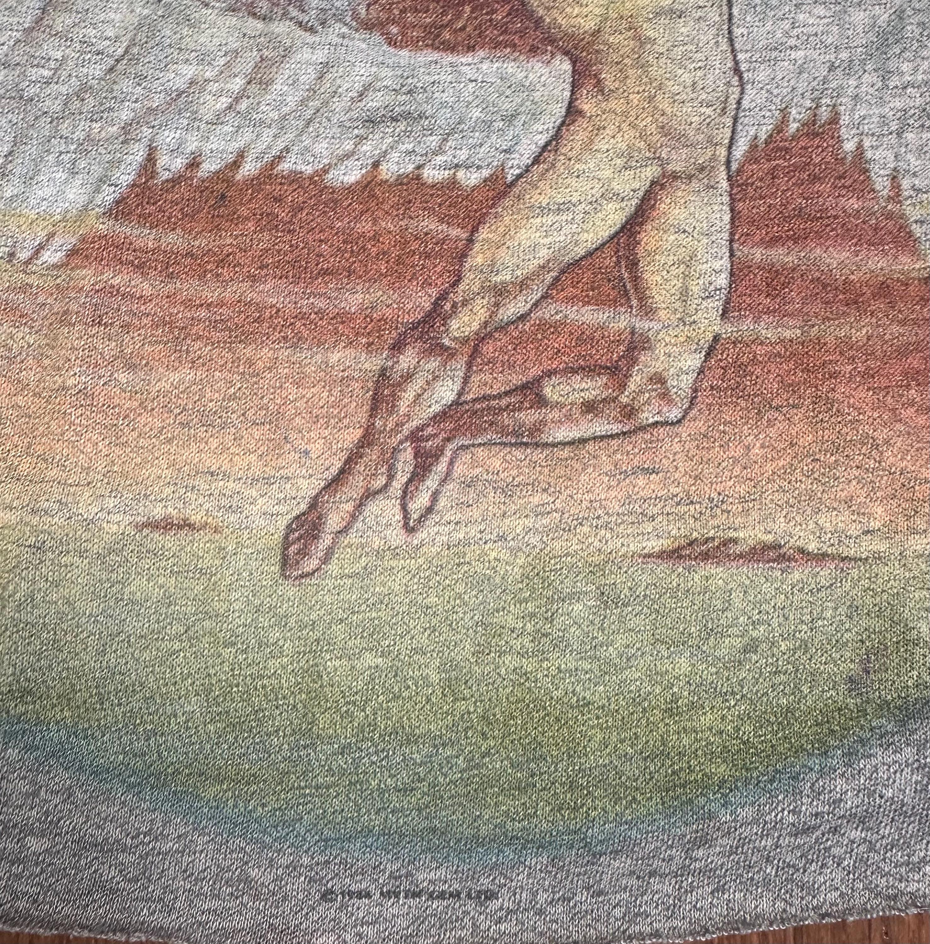 The fabric is perfectly worn in, thin in all the right ways, with visible distressing and a hole at the side seam. The graphic has that soft, faded look that only comes from decades of wear.