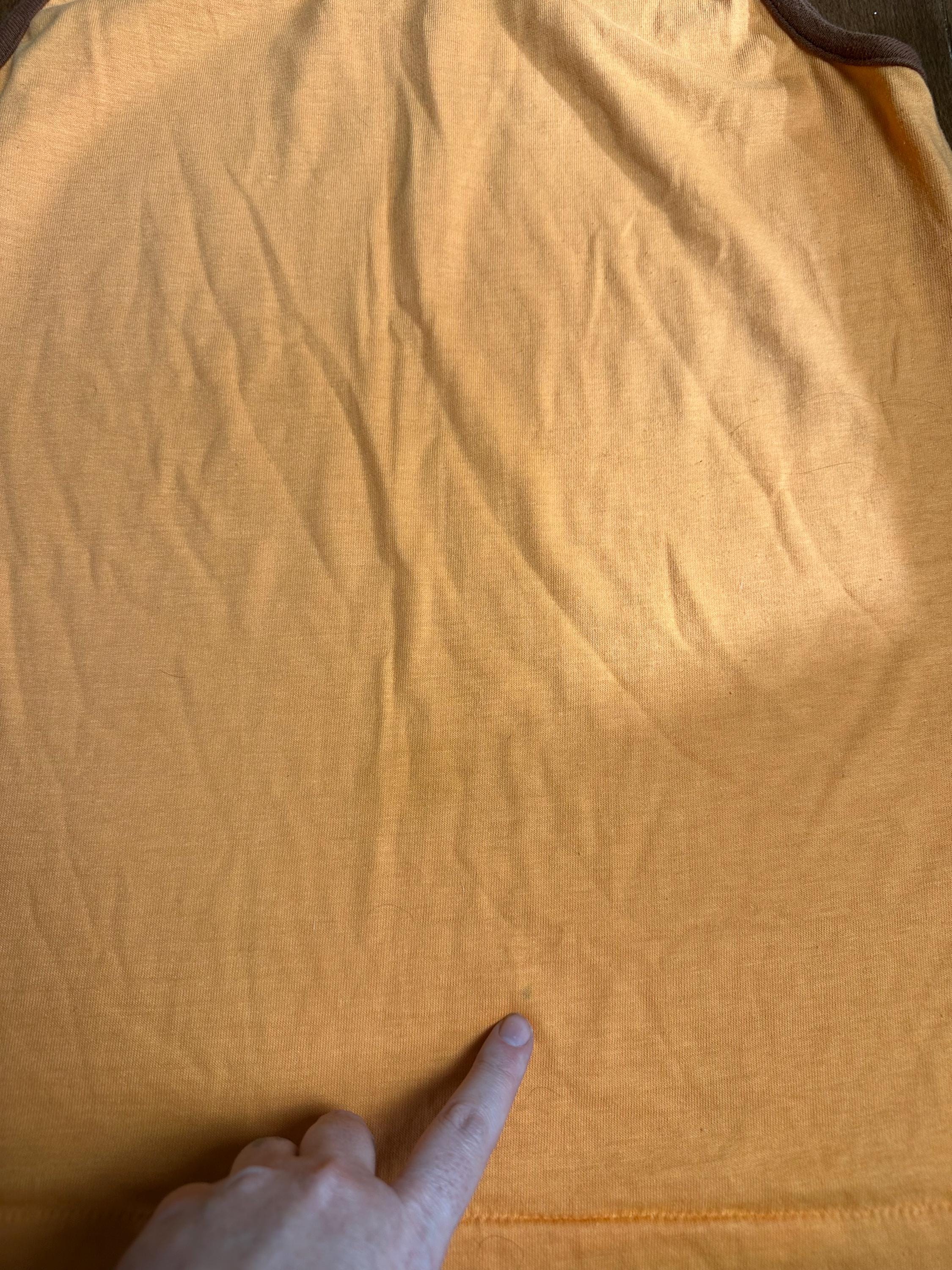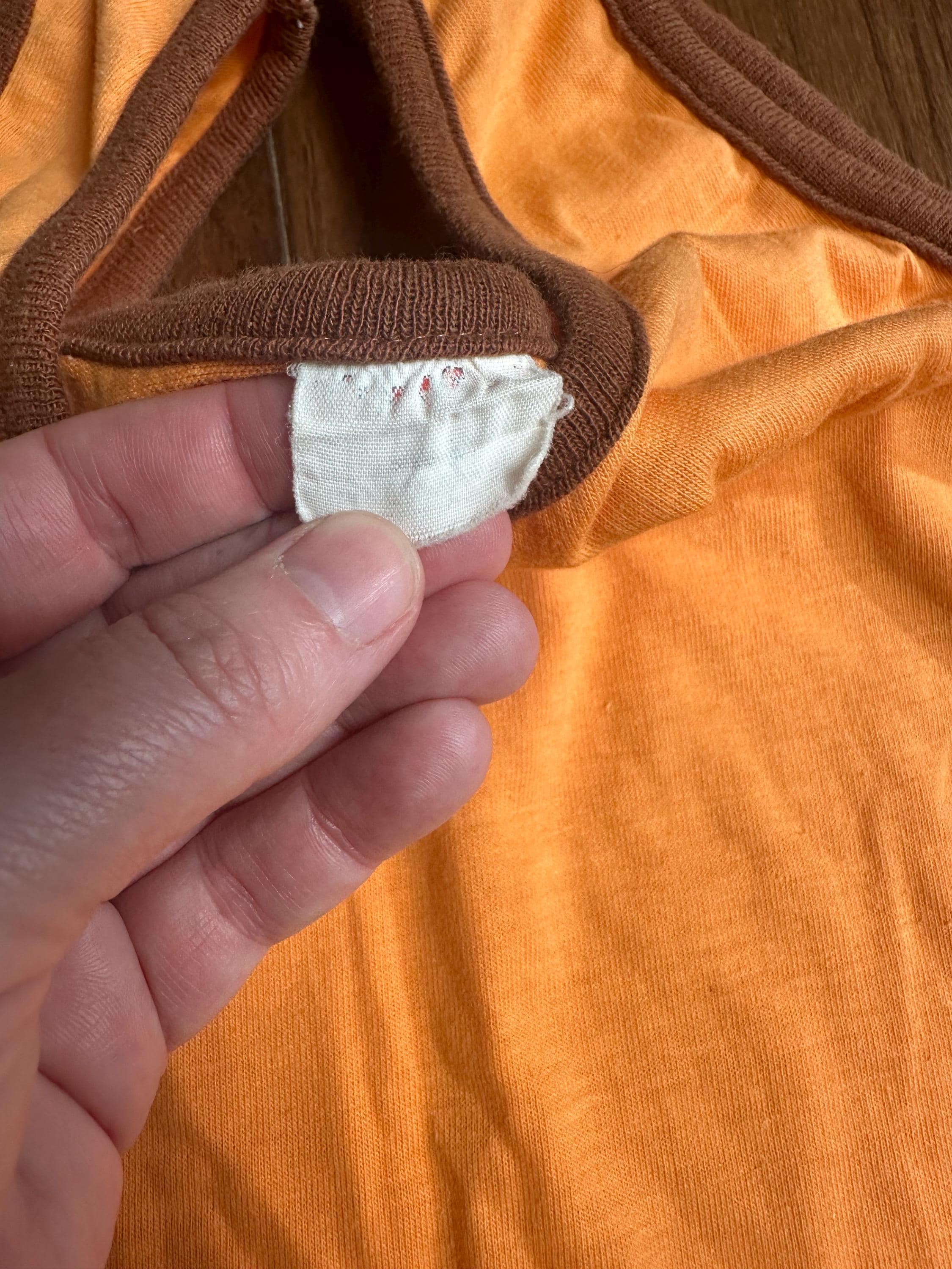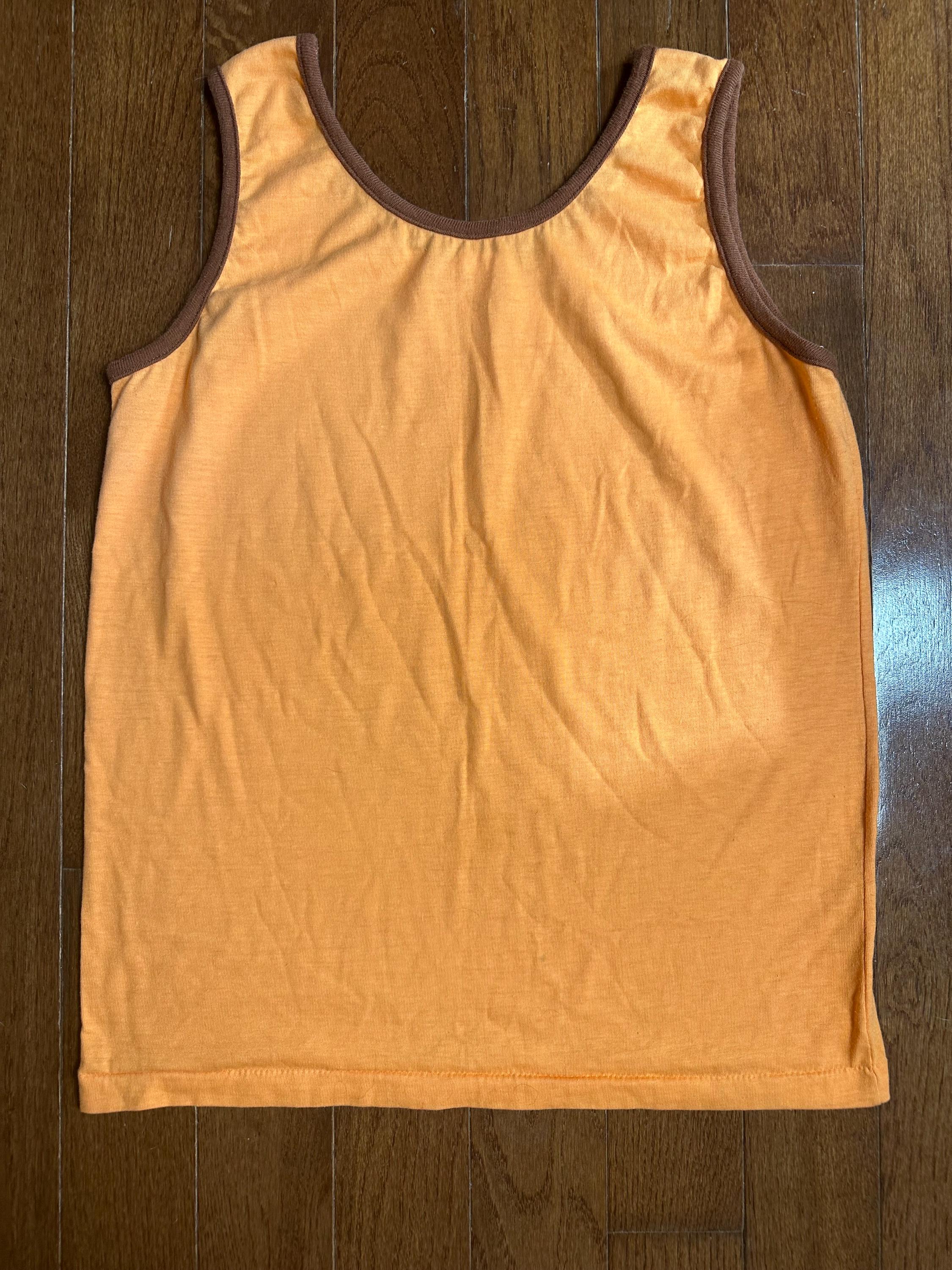 A true vintage essential from the 1970s. This ringer tank features a soft, worn-in cotton feel with a faded orange body and contrasting brown trim. Simple, classic, and exactly the kind of piece that makes a vintage outfit feel effortless.