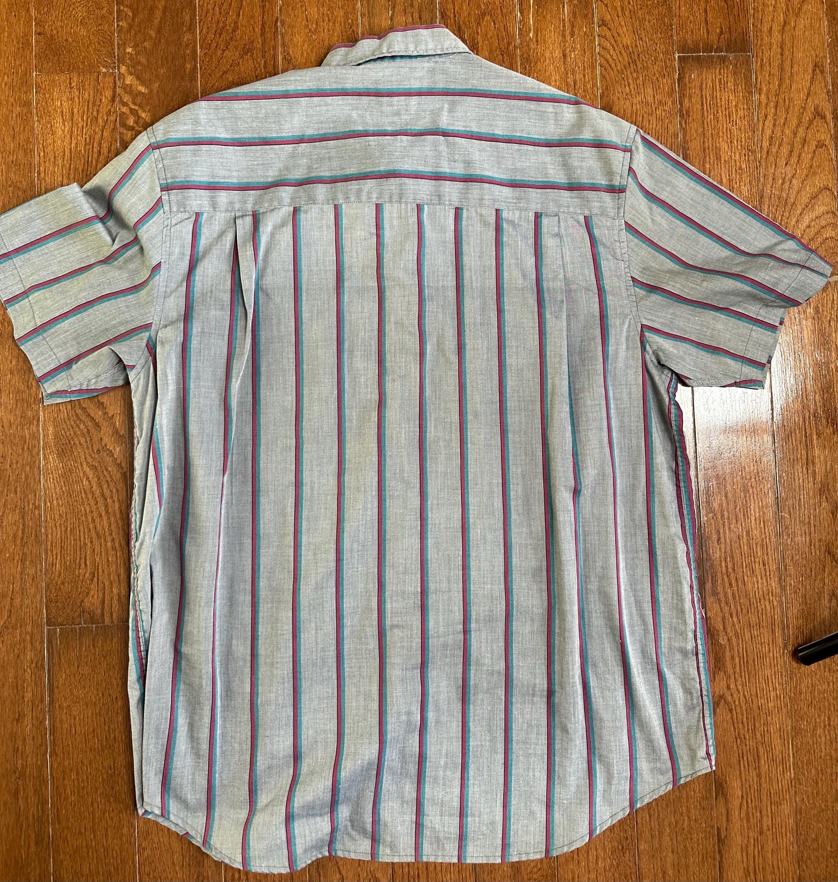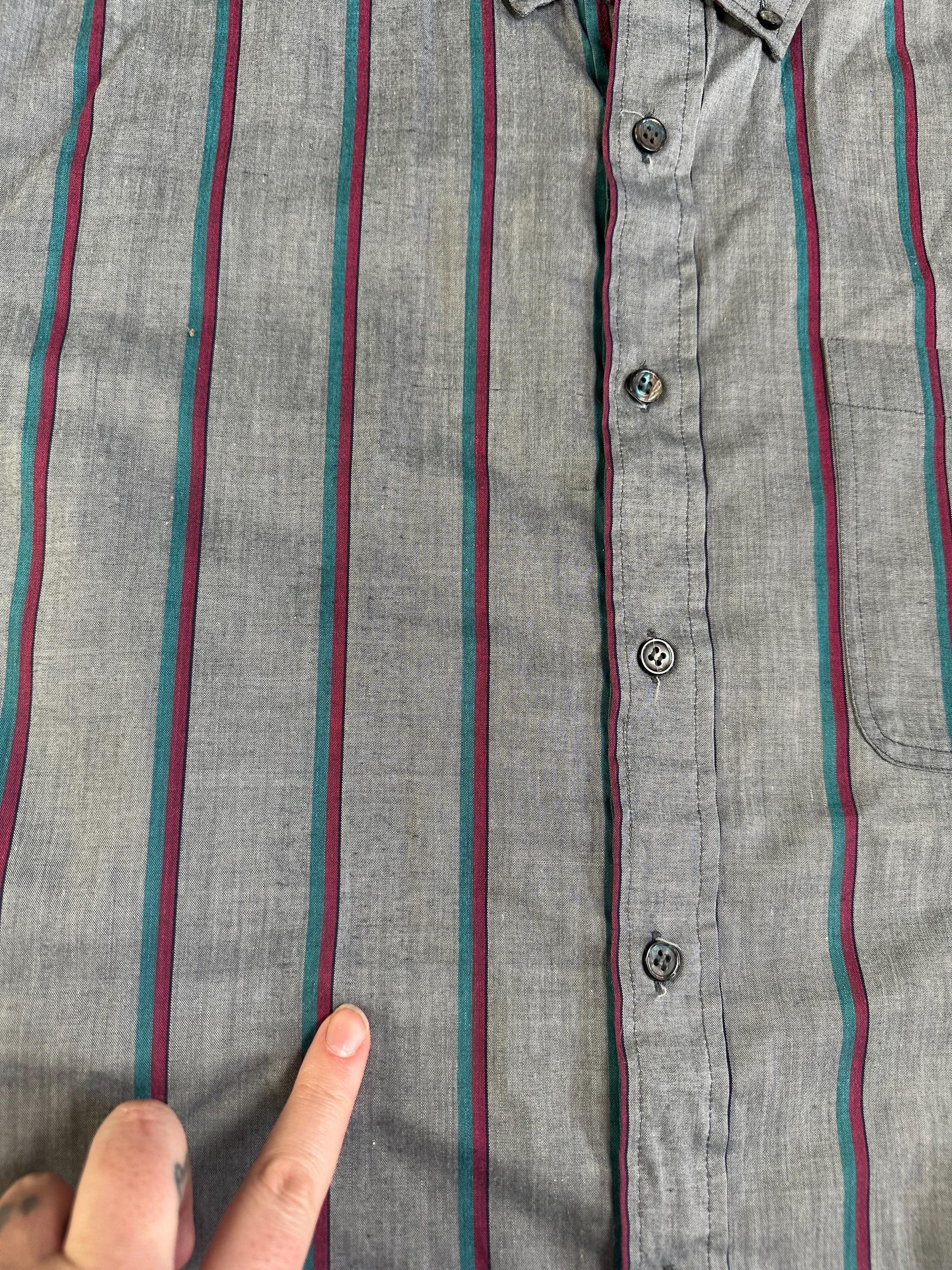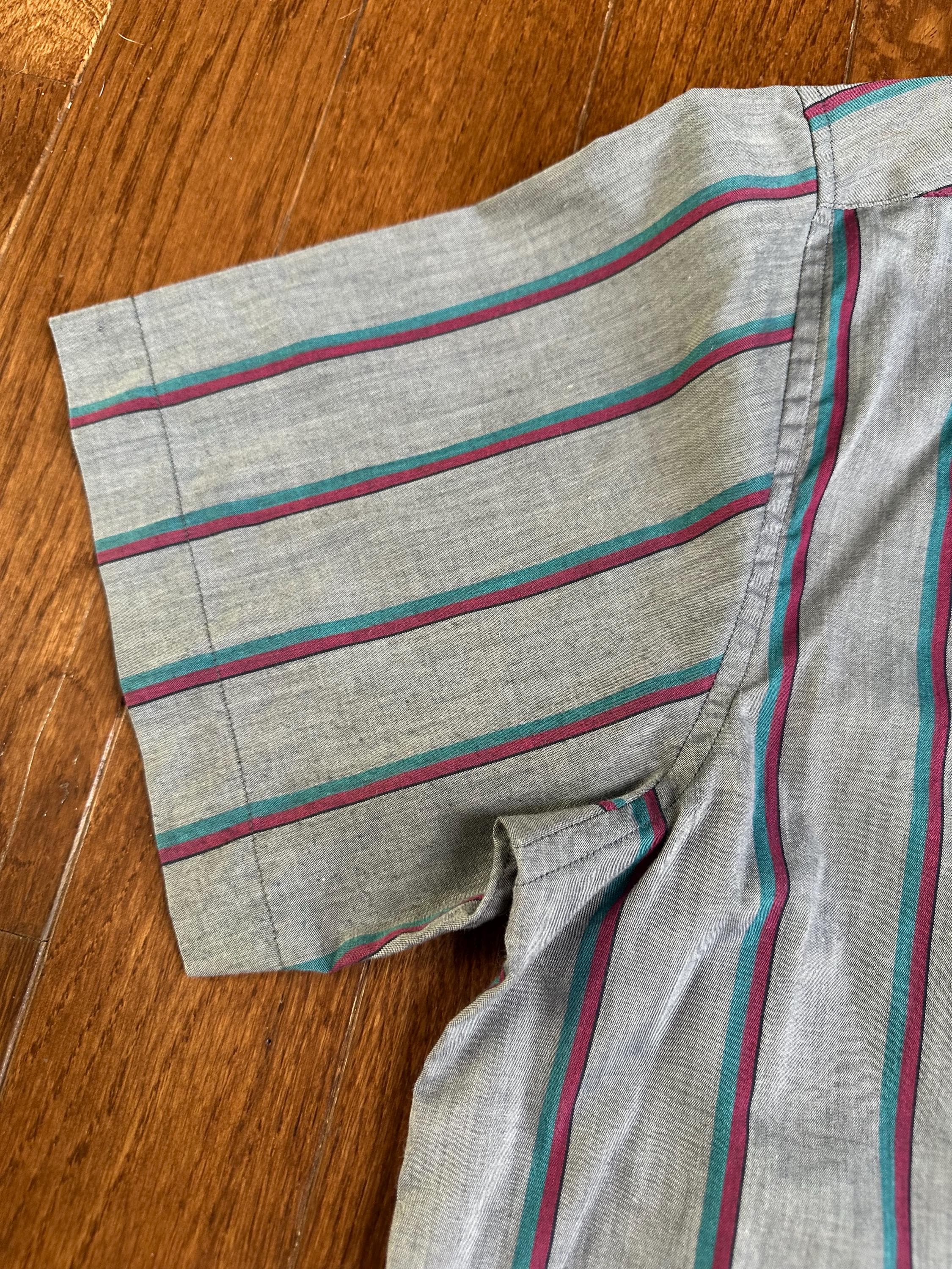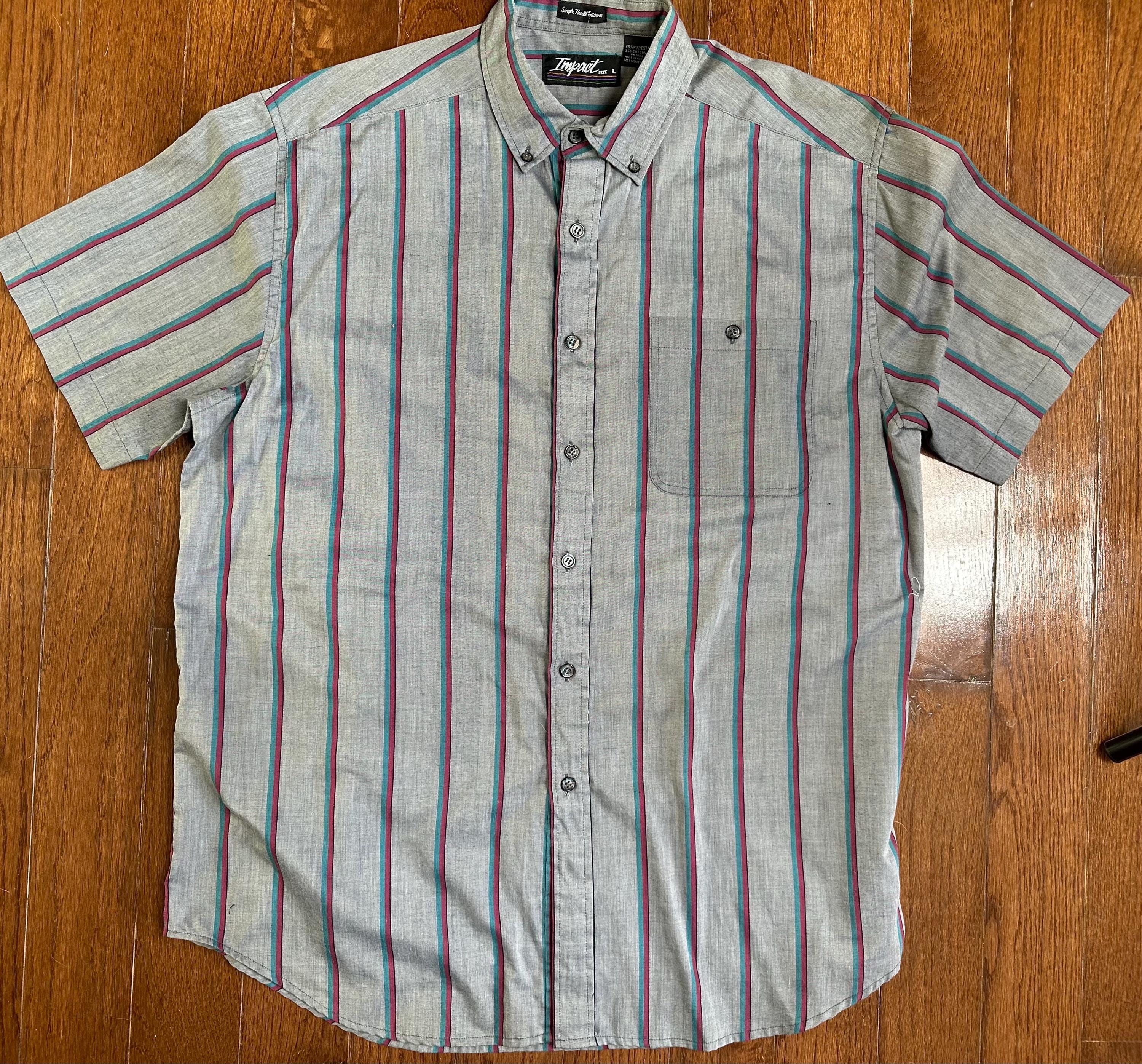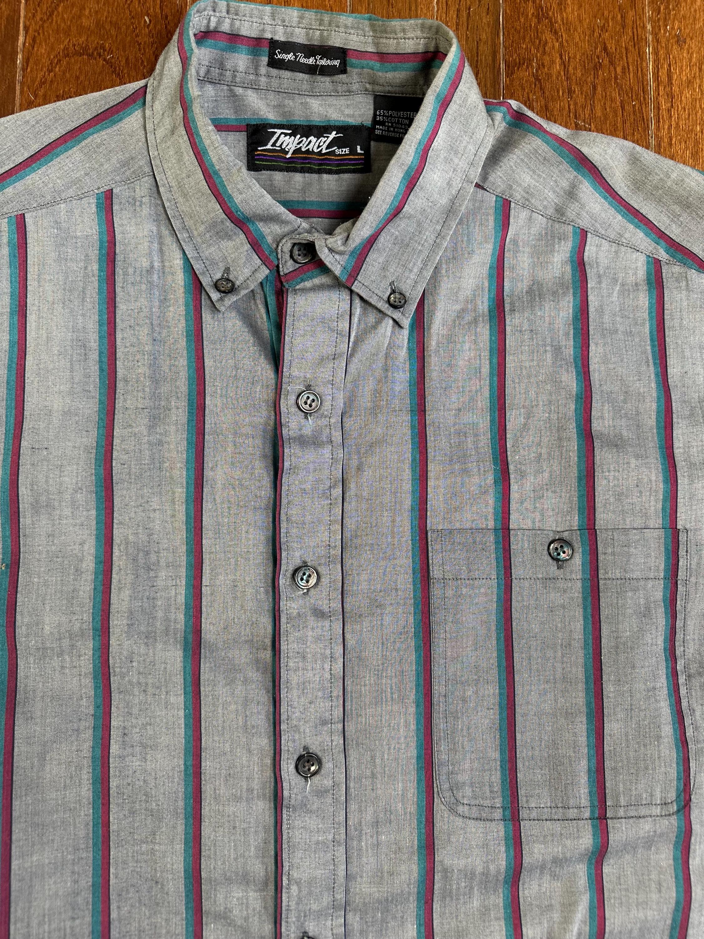 A clean vintage button-down with an easy, relaxed feel. This Impact shirt features a soft grey base with subtle teal and burgundy striping, giving it a slightly elevated look while still feeling casual and wearable.