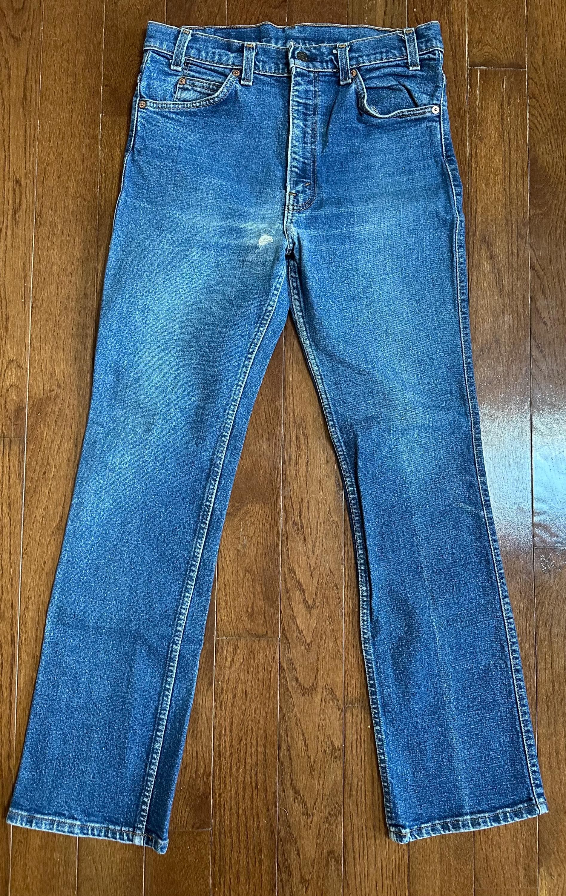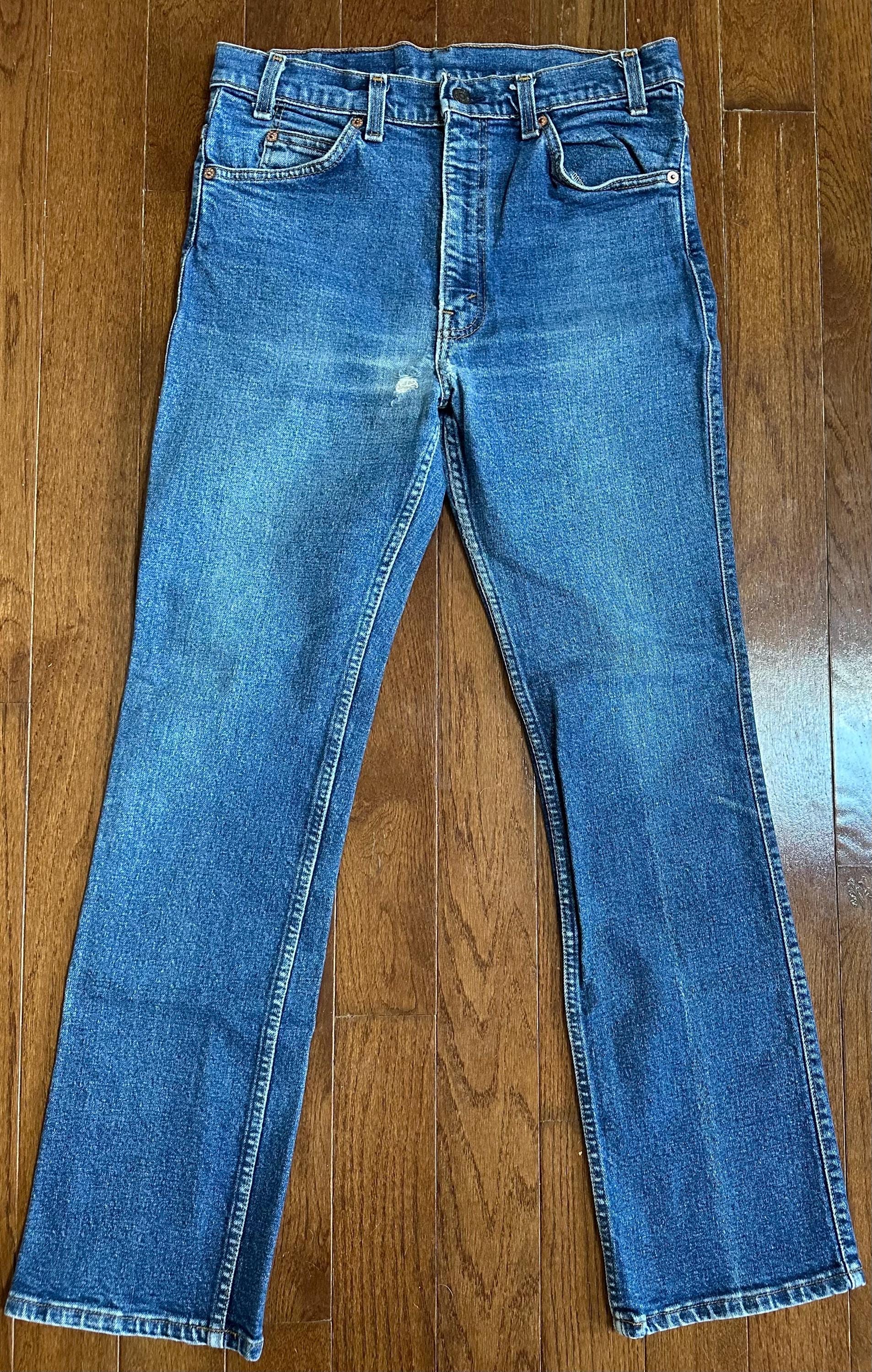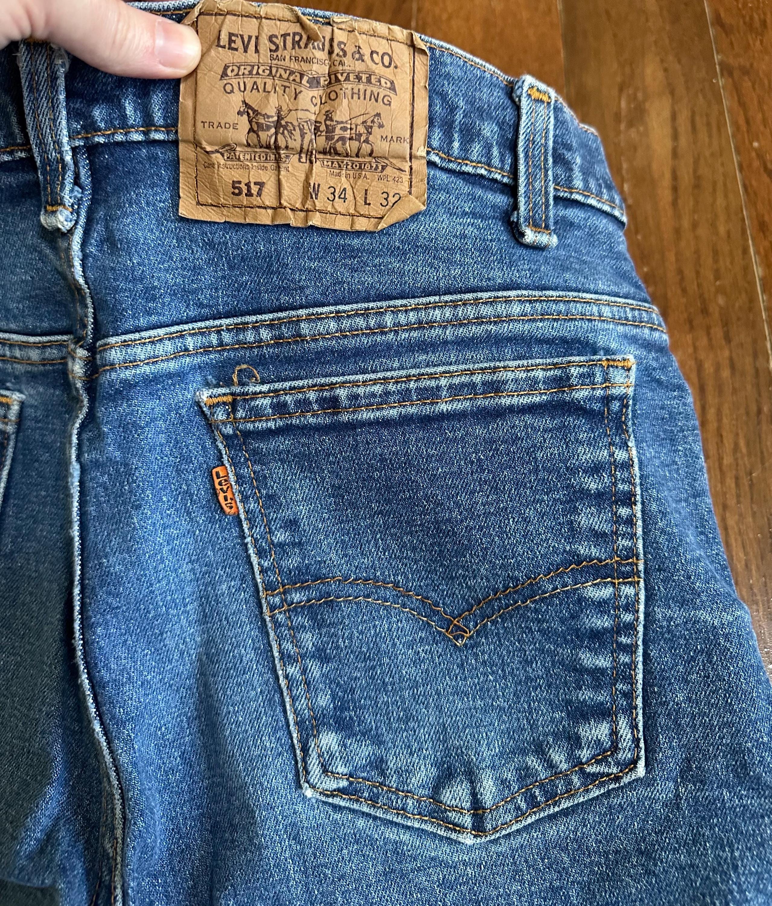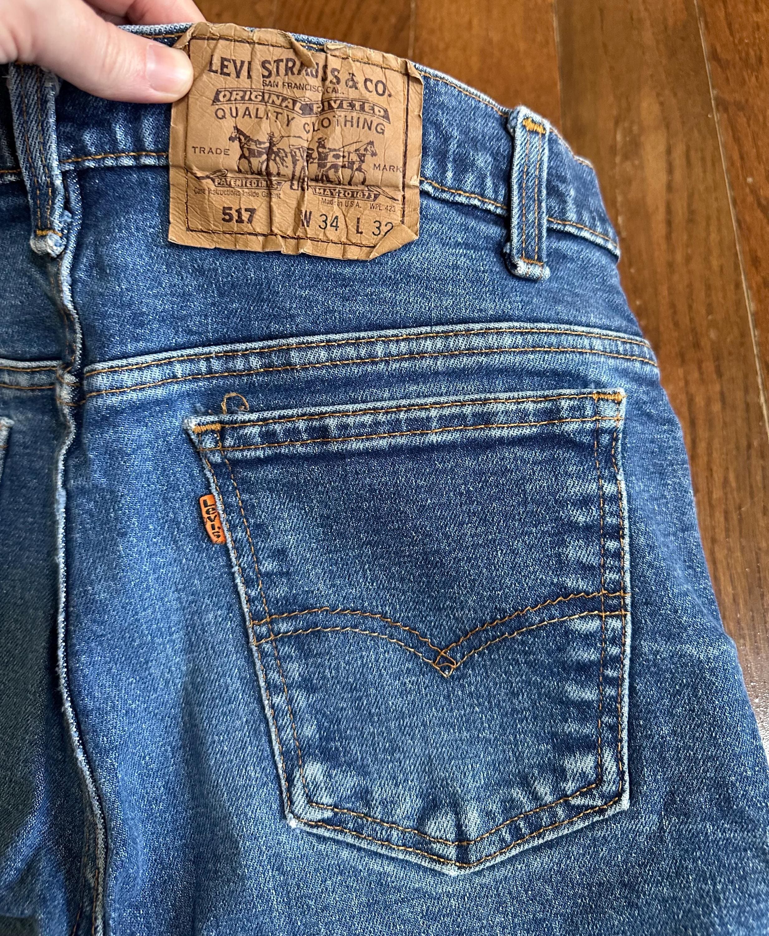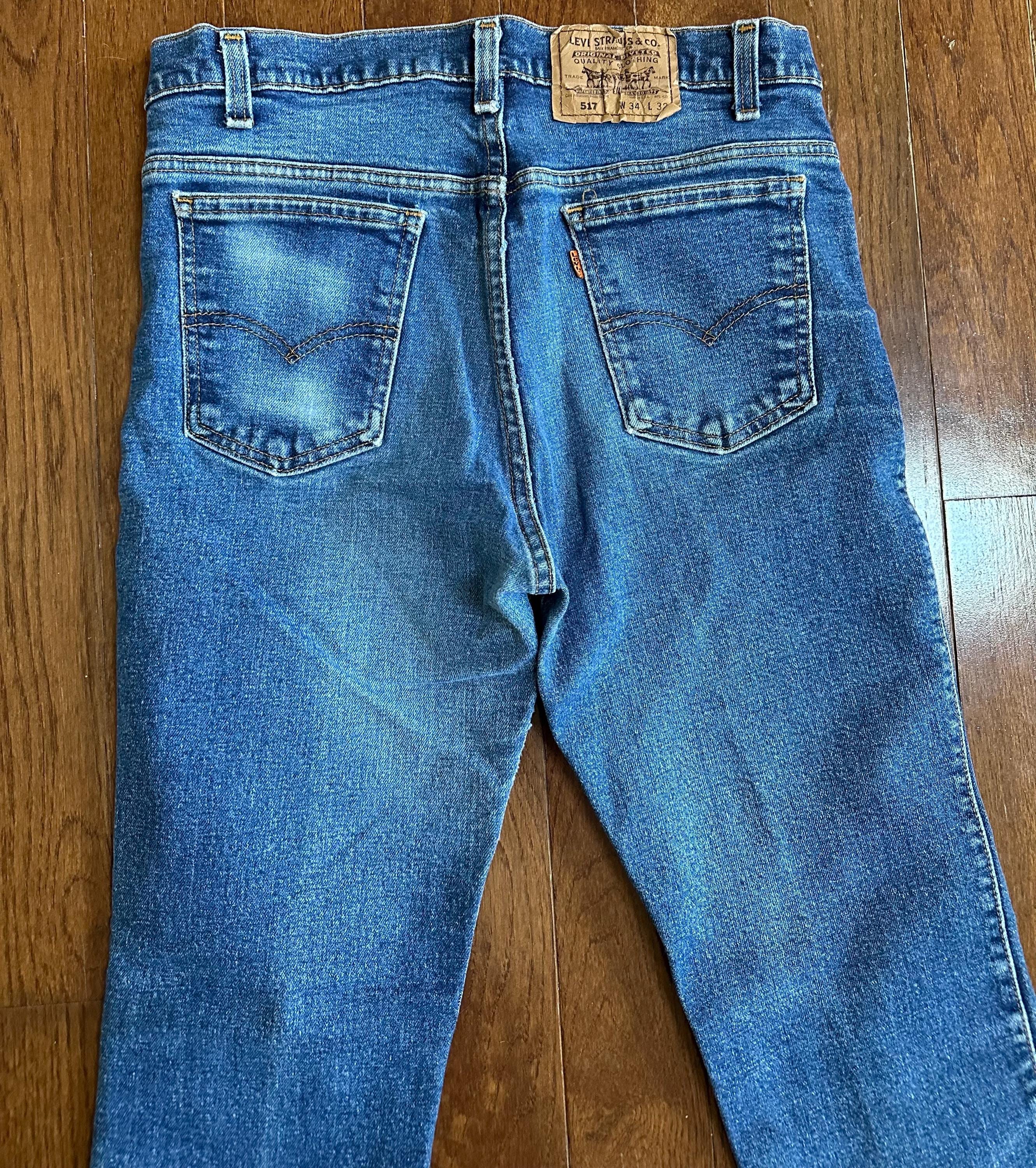 Vintage Levi’s 517s, made in the USA, broken in the way only time can do. The fade is honest and natural, with soft wear through the thighs and a lived-in feel that gives the denim real depth.