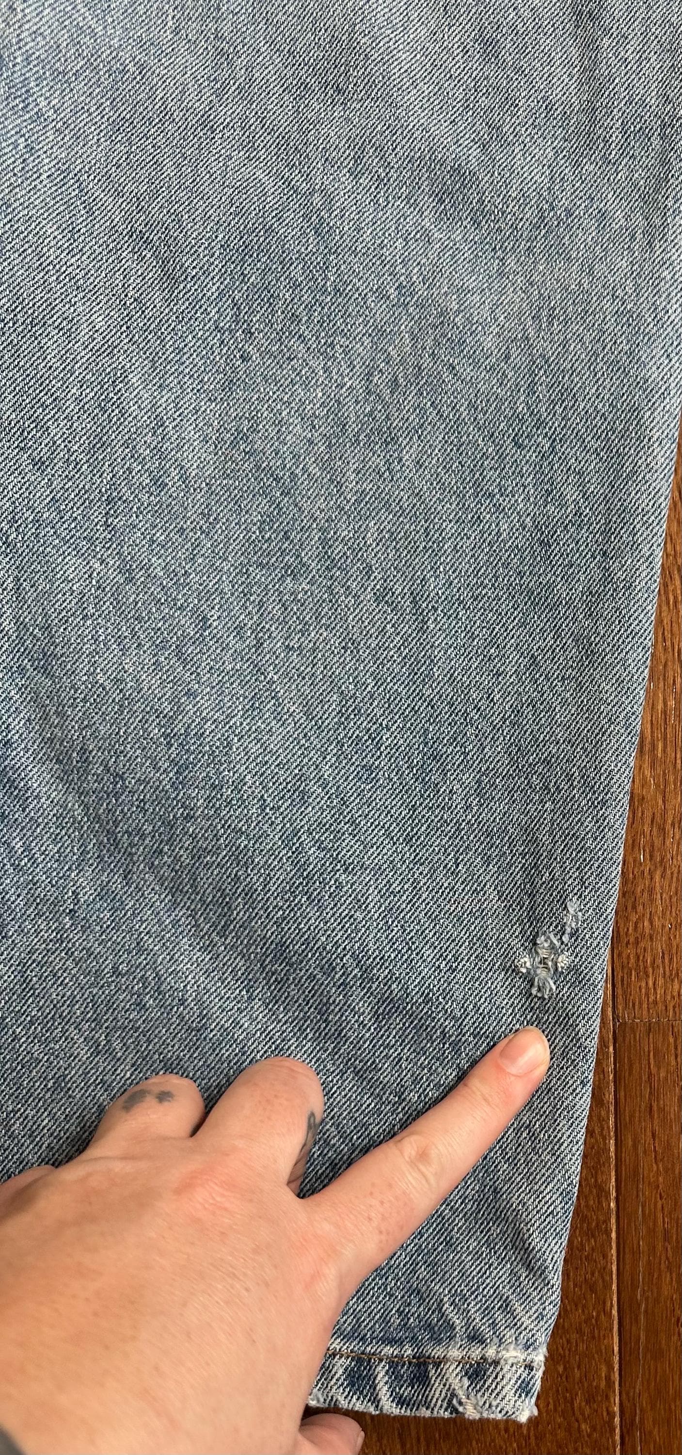 That classic light wash hits immediately. Soft fade throughout with subtle wear that gives them that easy, everyday look without trying too hard. The denim has relaxed into a comfortable drape that only comes with time.