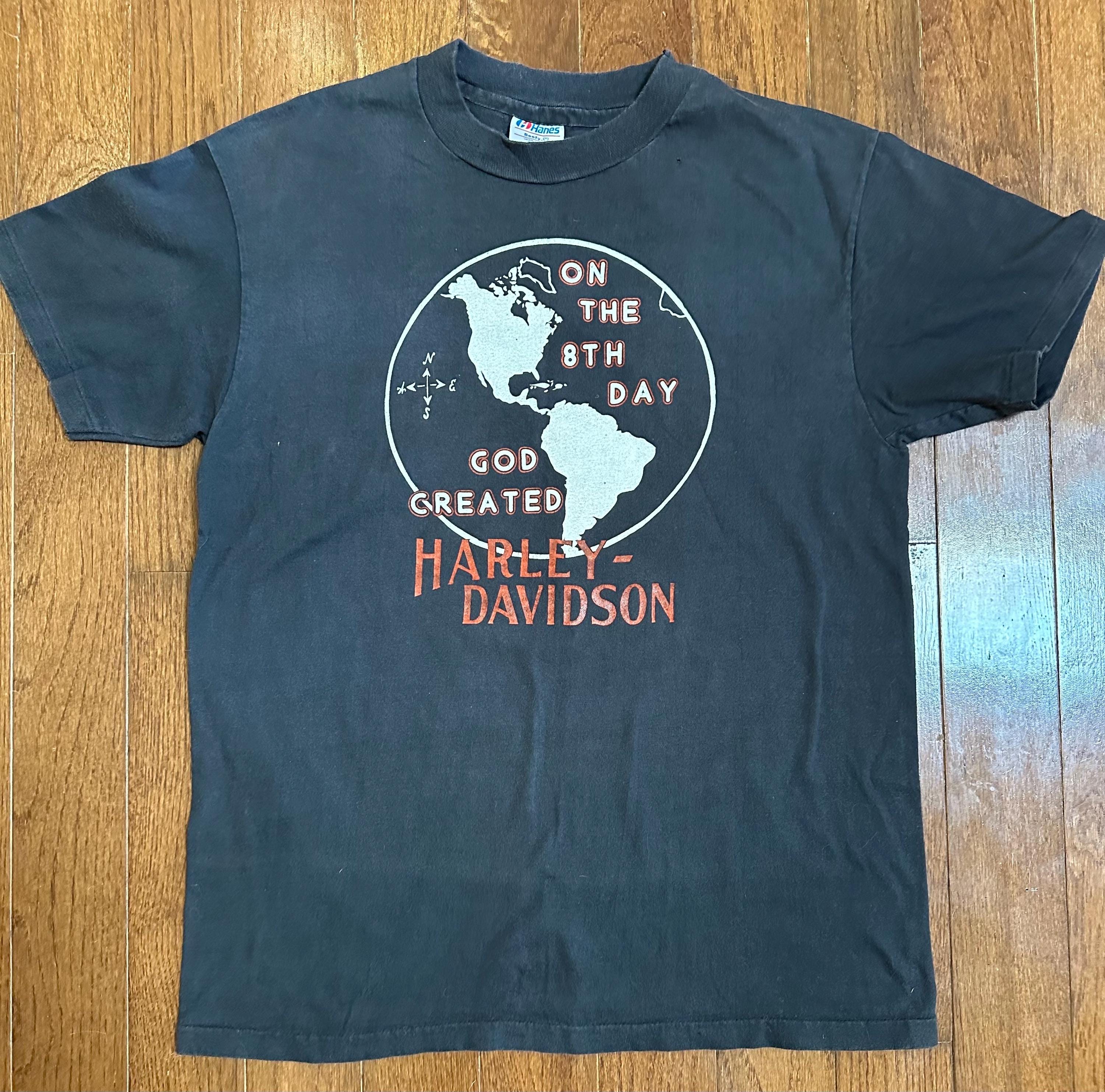 Front: “On the 8th Day God Created Harley-Davidson” w/ globe