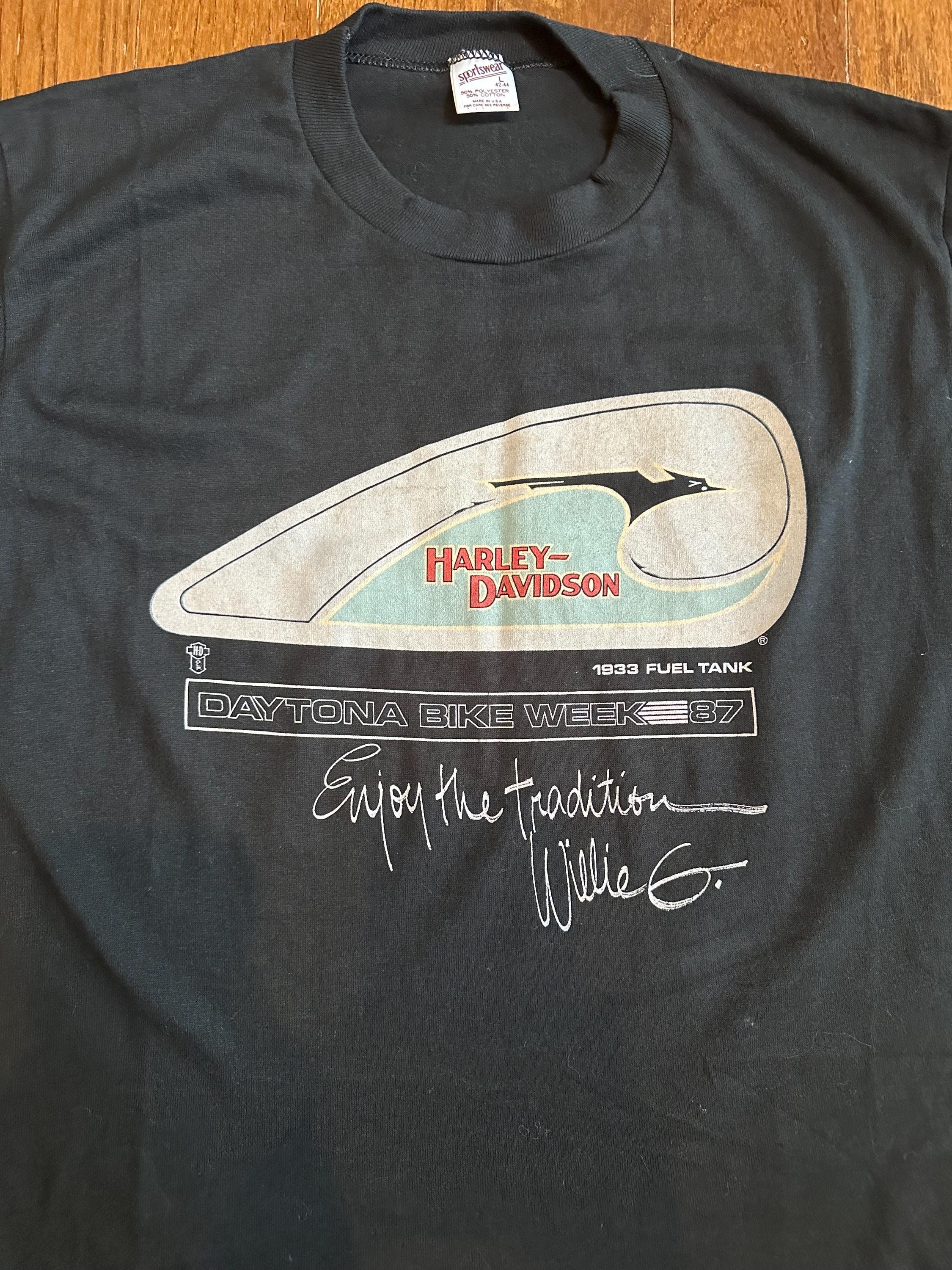 Velvet soft and flawless—this 1987 Harley Davidson Daytona Bike Week t-shirt is a true piece of motorcycle history. The design features the classic 1933 Harley tank graphic with the phrase “Enjoy the tradition – Willie G”.