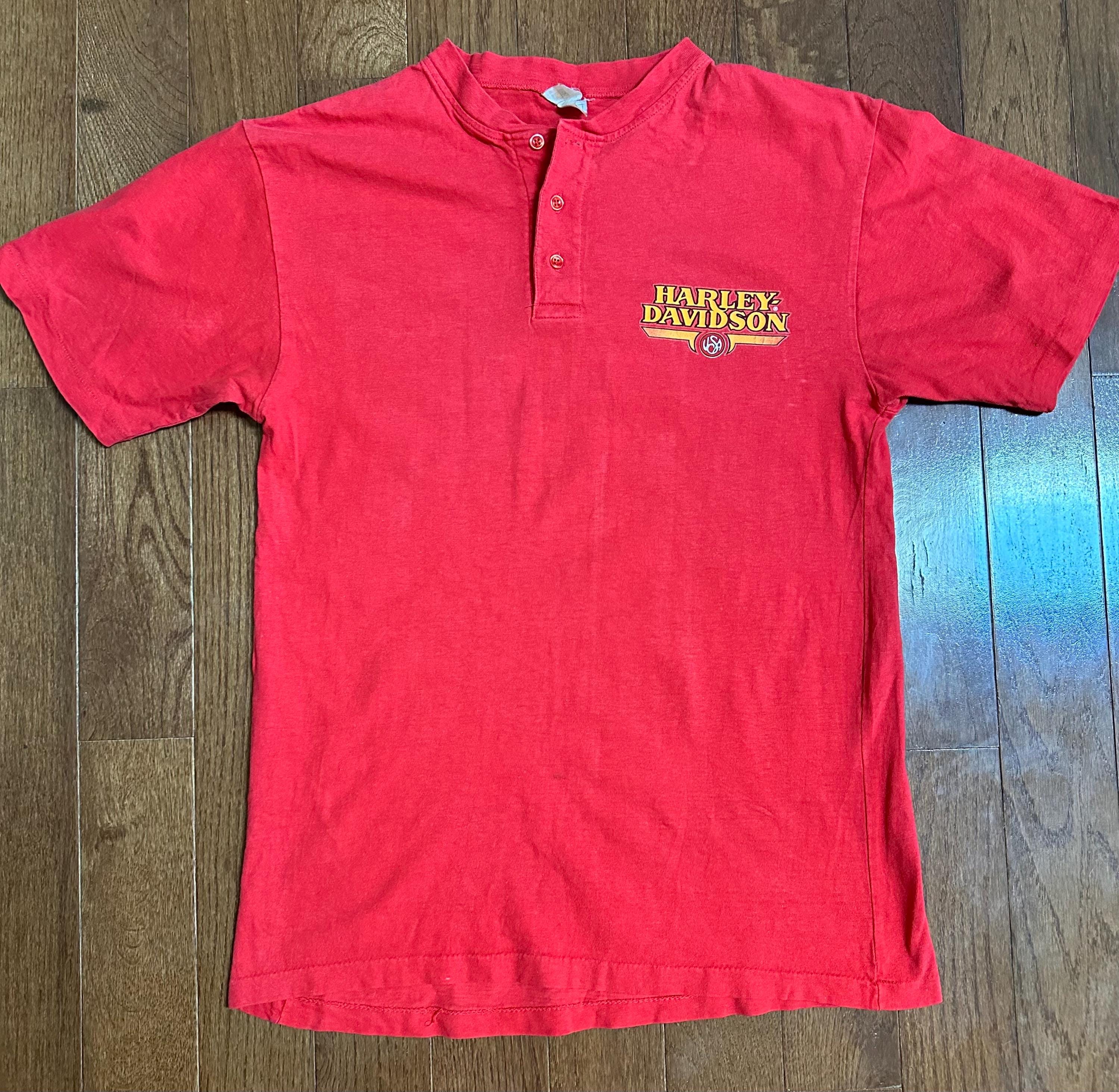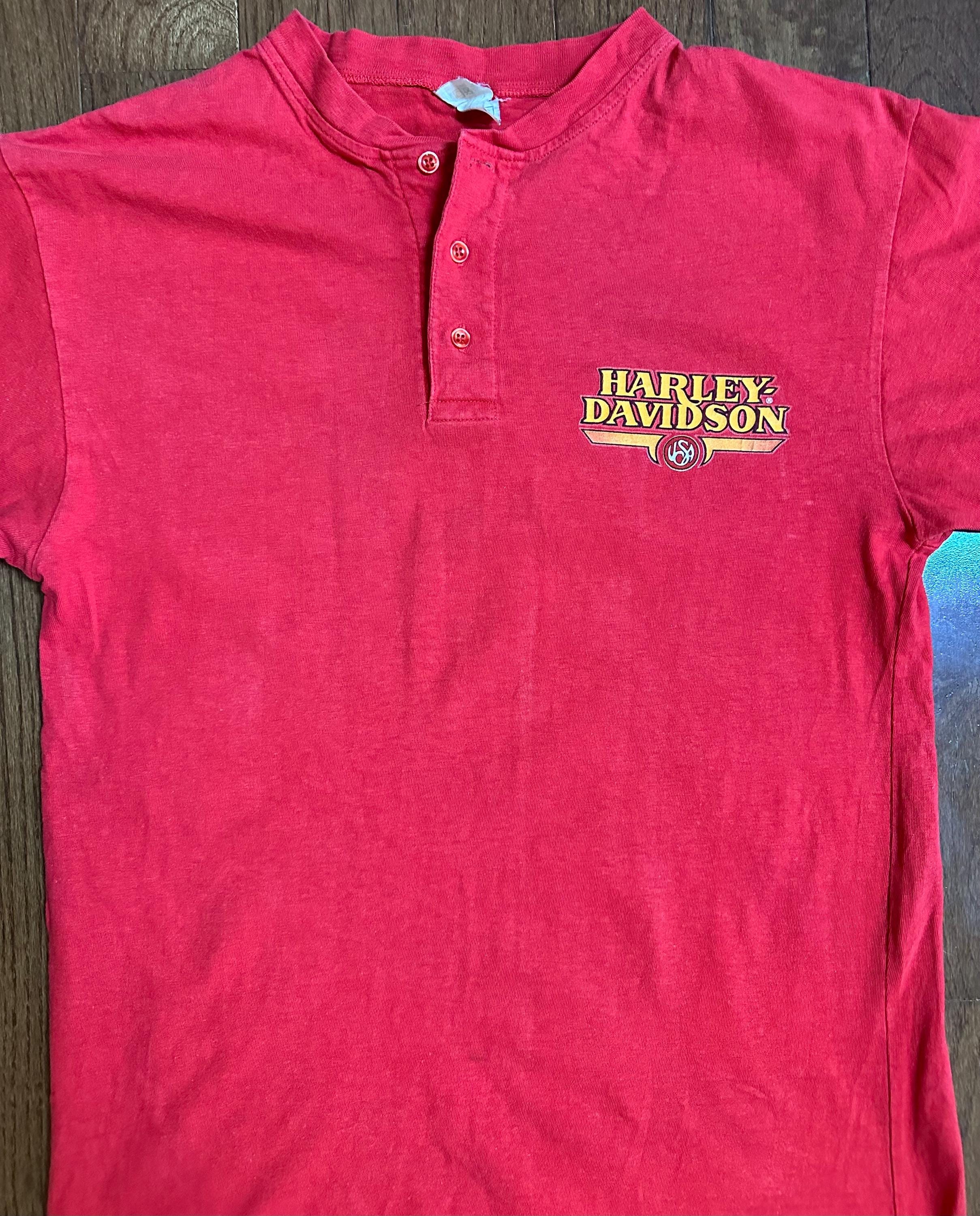 A classic late-80s Harley Henley—casual, shop-stamped, and road-ready.